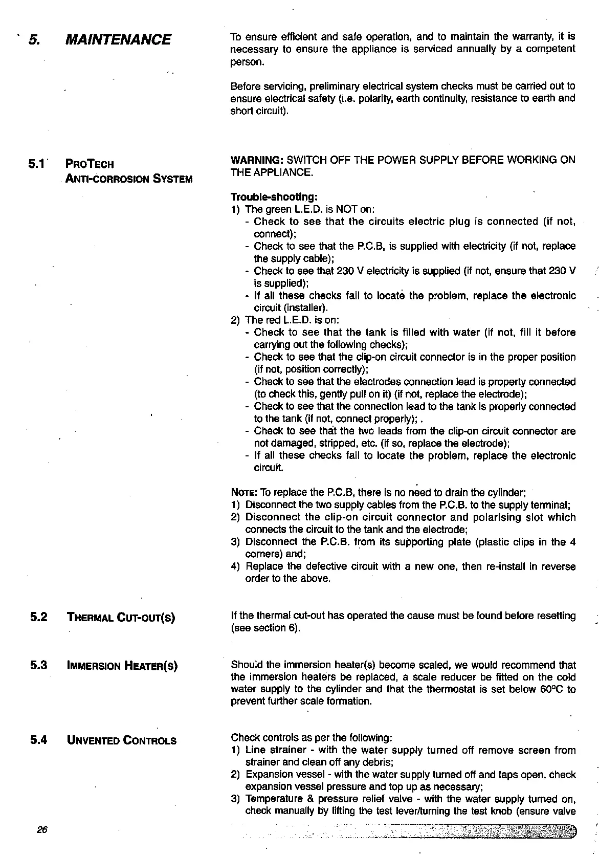 Ariston Classico HE STD 125 - Maintenance; 5.1 ProTech Anti-corrosion System; 5.2 Thermal Cut-out(s); 5.3 Immersion Heater(s)