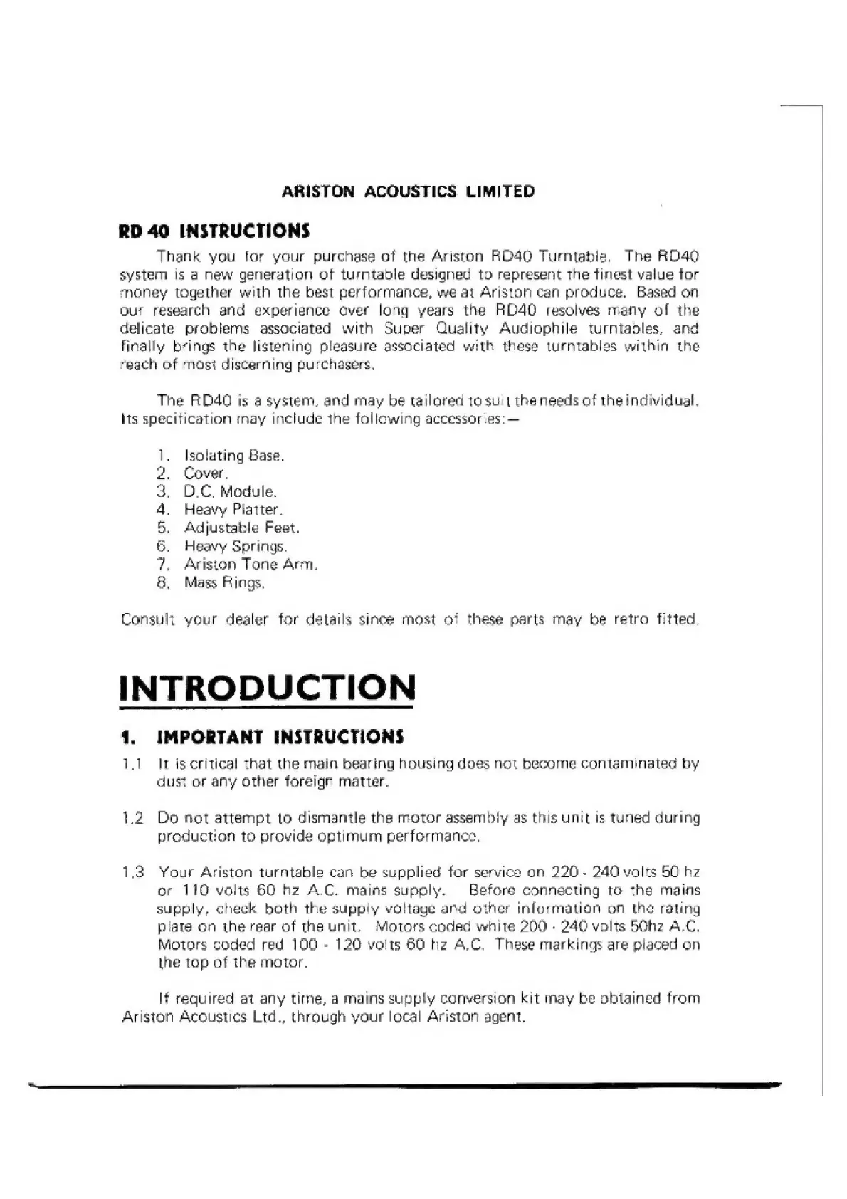 Ariston RD 40 - Introduction; 1. Important Instructions