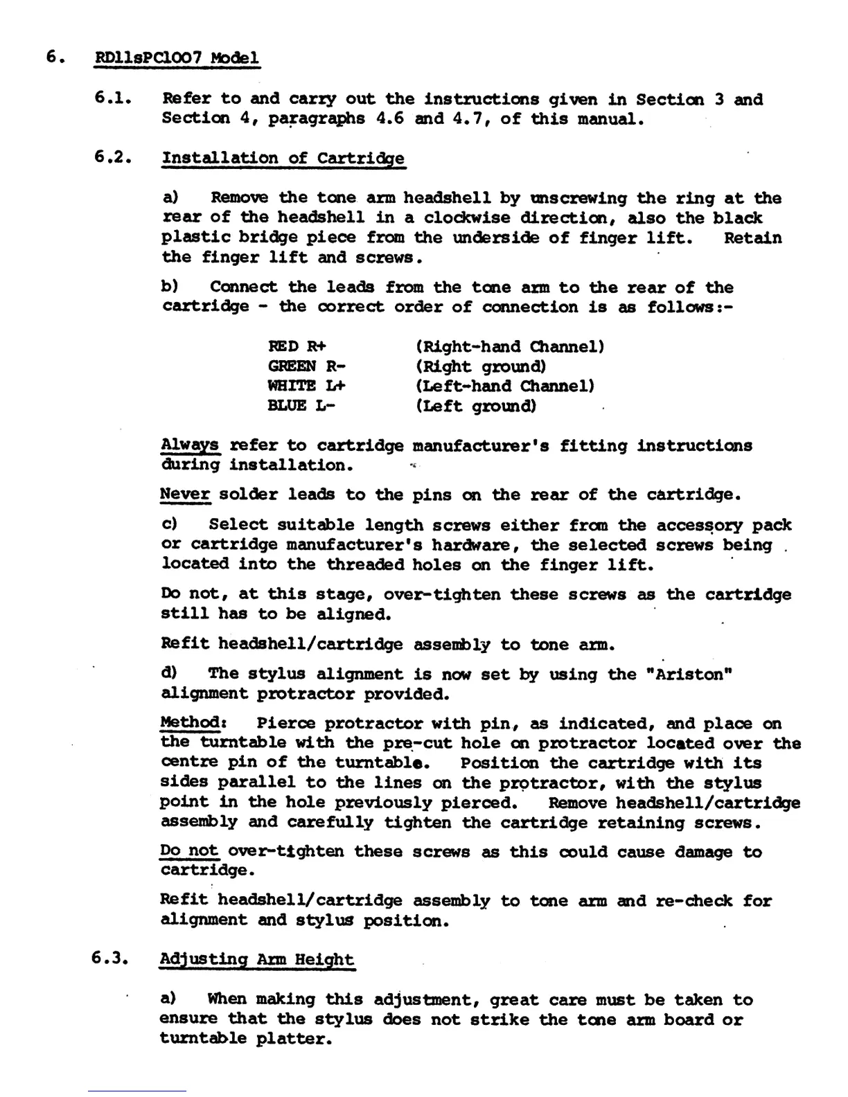Ariston RD11s - Ariston RDllsPC1007 Model Setup; Cartridge Installation; Adjusting Arm Height