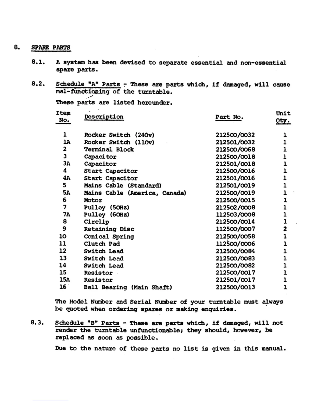 Ariston RD11s - Spare Parts Information; Schedule A Parts; Schedule B Parts