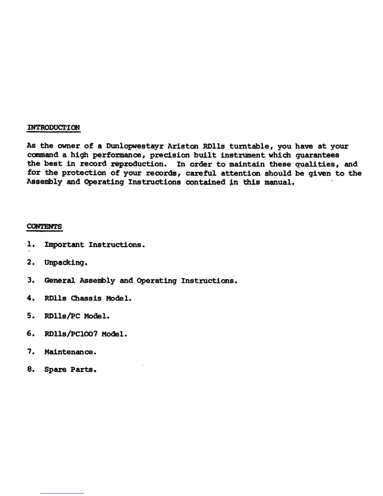 Ariston RD11s - Introduction; Contents