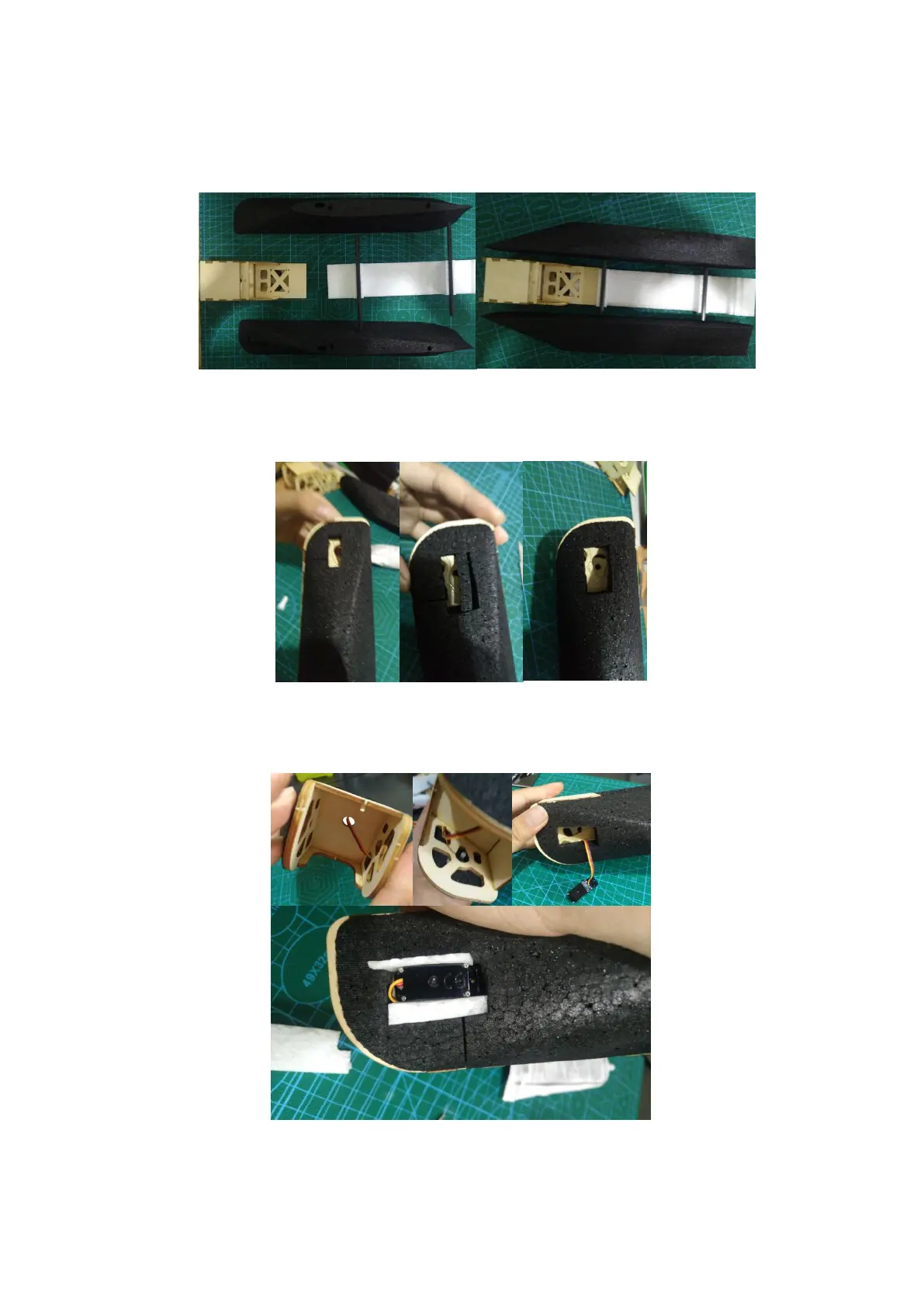 String the servo cables following the picture. Use wasted foam to prepare two chips to fix the