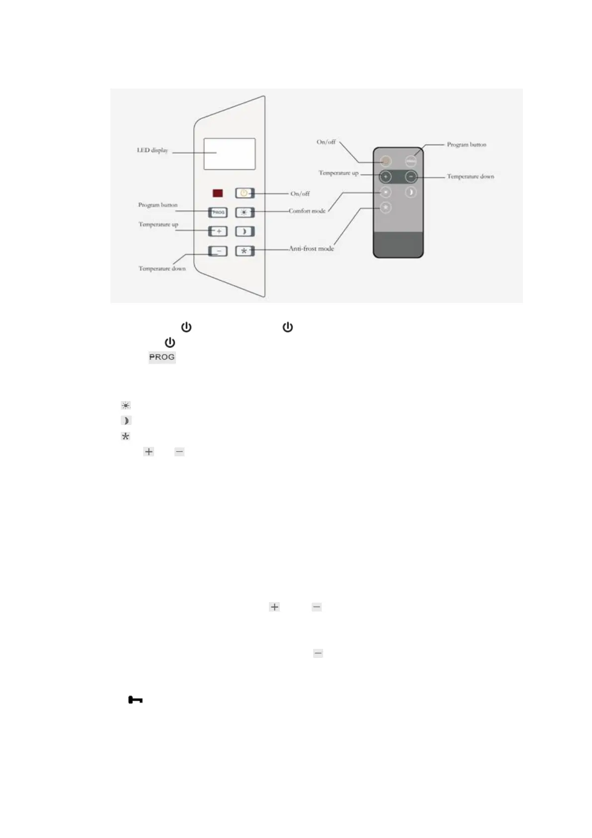 (1)On/Off “ ” button: a. Press “ ”. The heater starts working. When the heater is