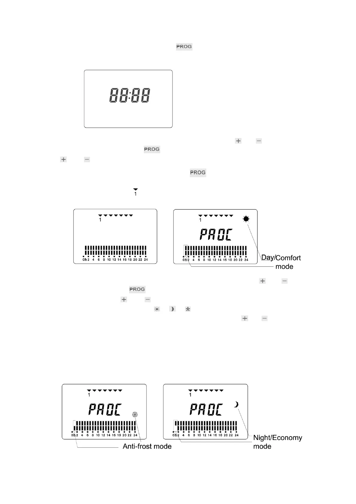 2. By pressing the“ ”or“ ”to regulate the working time (0-24hrs) of each mode.