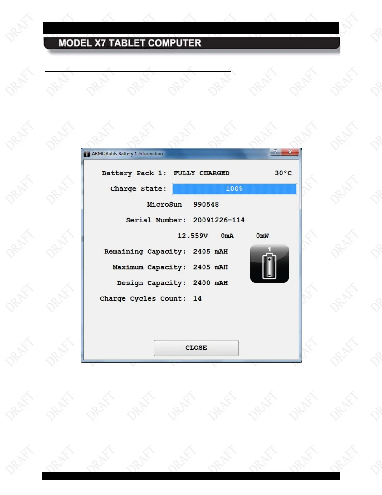 Information window (example shown in Figure 51). Readings such as percentage of charge,