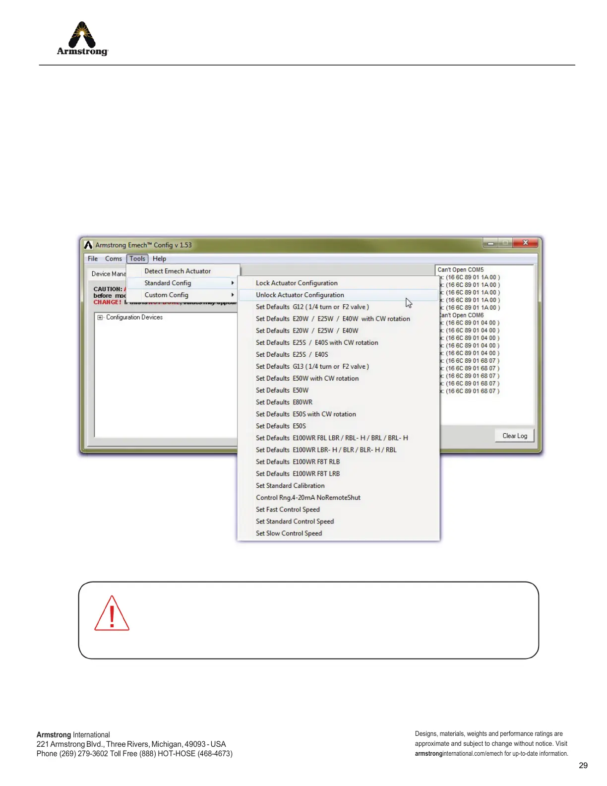ALWAYS select the ‘Unlock Actuator Configuration’ function from the ‘Tools>StandardConfig’