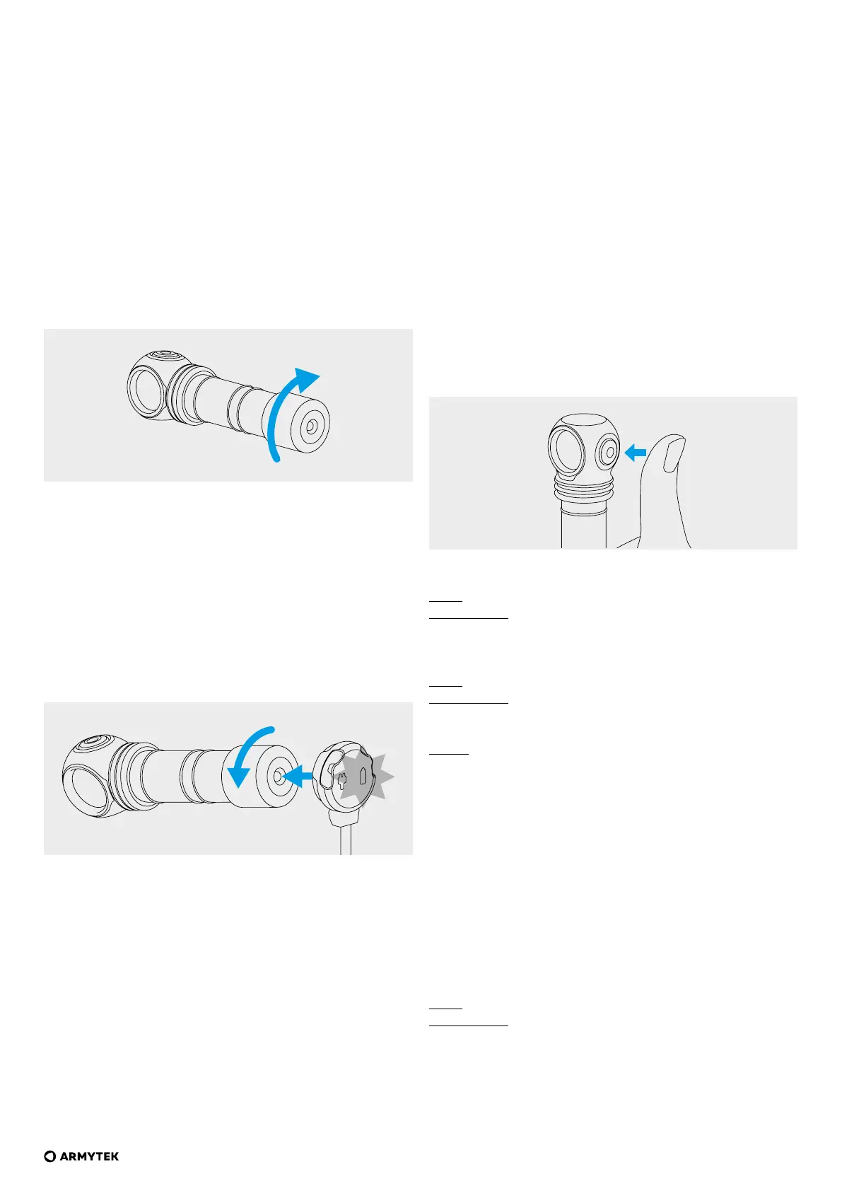 • Red blinking — unscrew the tailcap for 1/4 for charging.