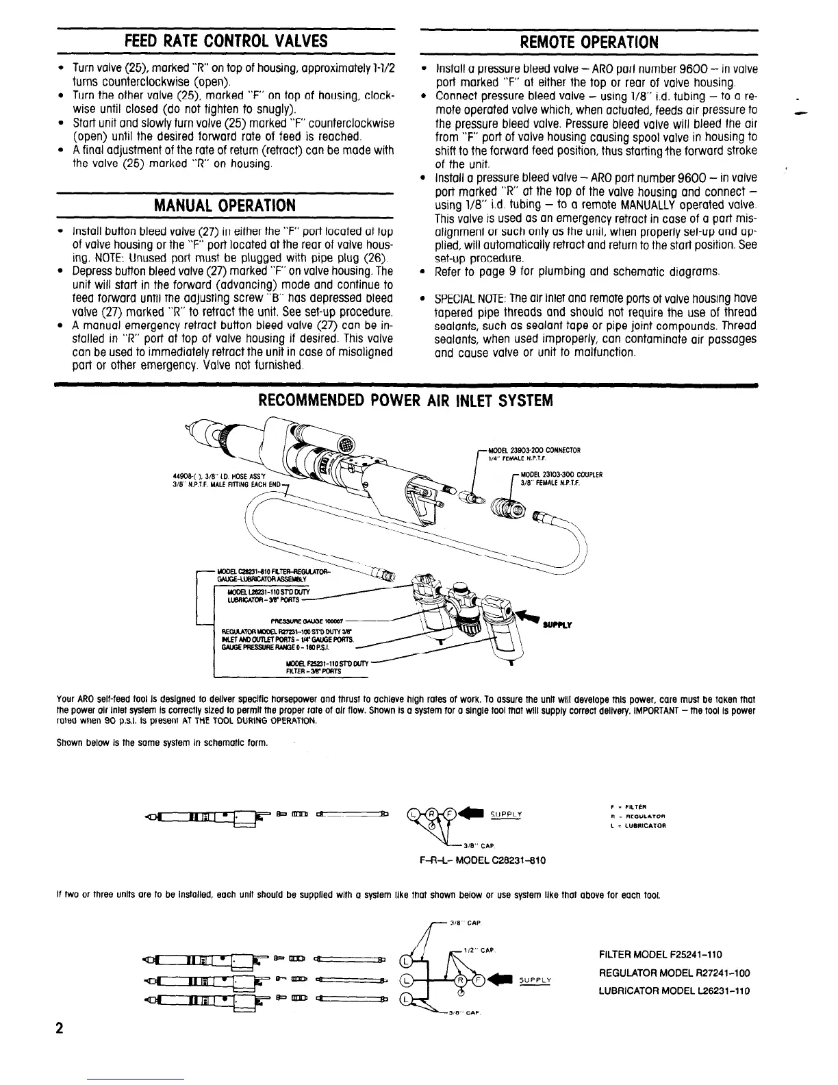 Your ARO self-feed tool is designed to deliver specific horsepower and thrust to achieve high rates of work. To assure the unit wilt develope this power, care must be token that