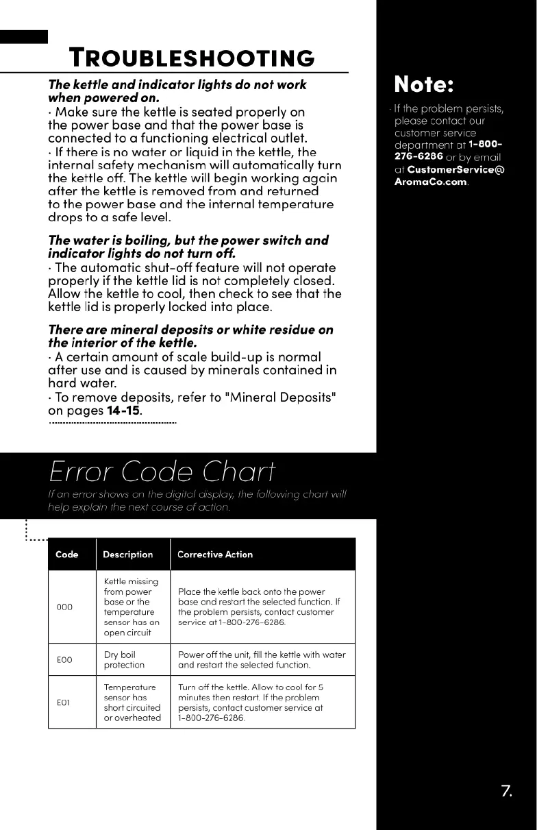 Aroma AWK-701 - Troubleshooting Common Issues; Error Code Chart