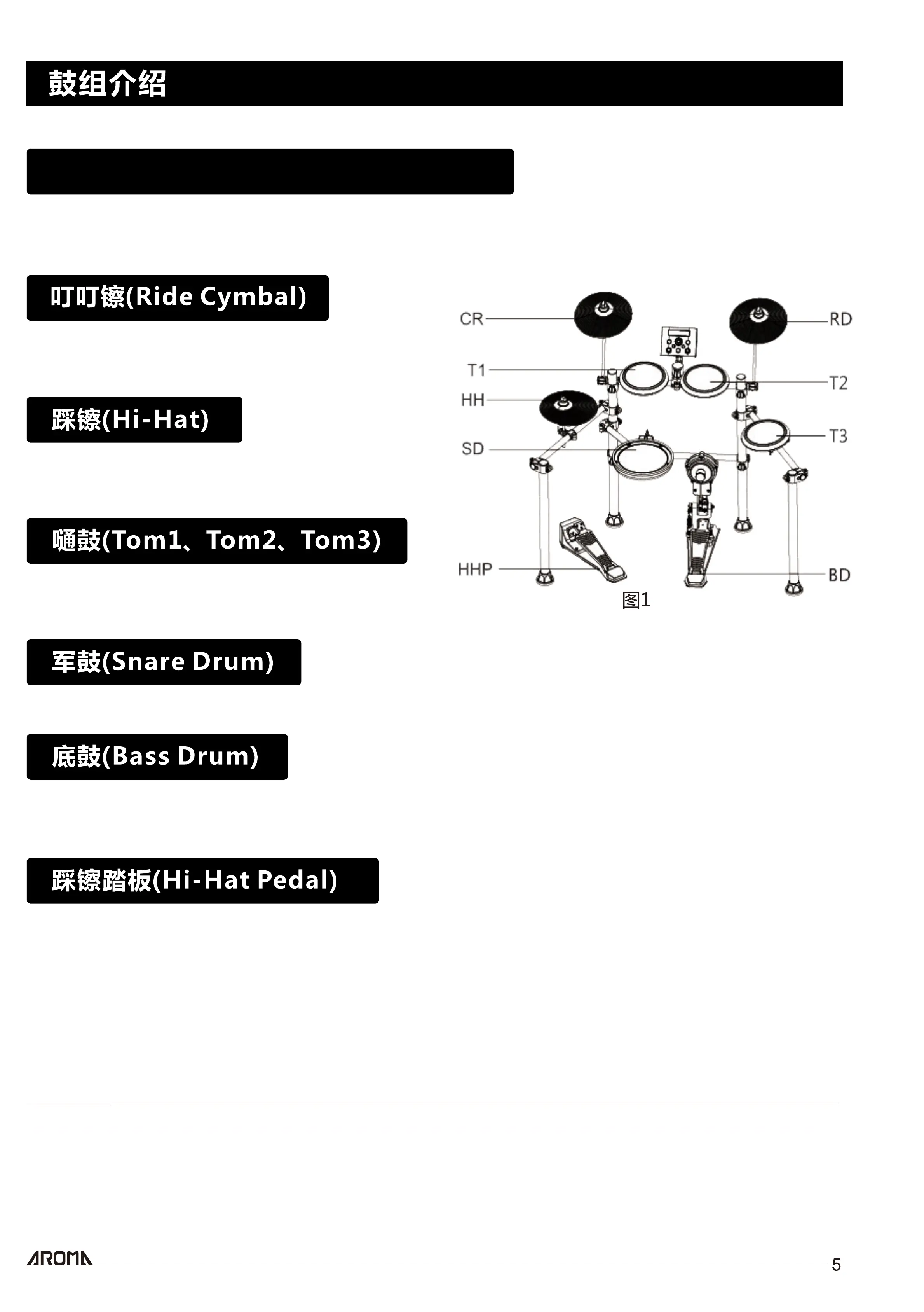 温馨提示: 以上简称描述的英文字符均贴在了每个鼓盘的音频插座附近,同时也是每个鼓盘与