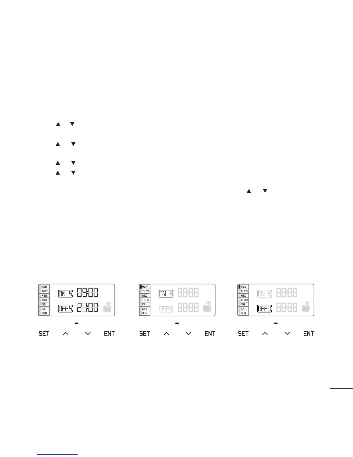 Press or button to adjust the ON time hours, then press ENT to move to the next