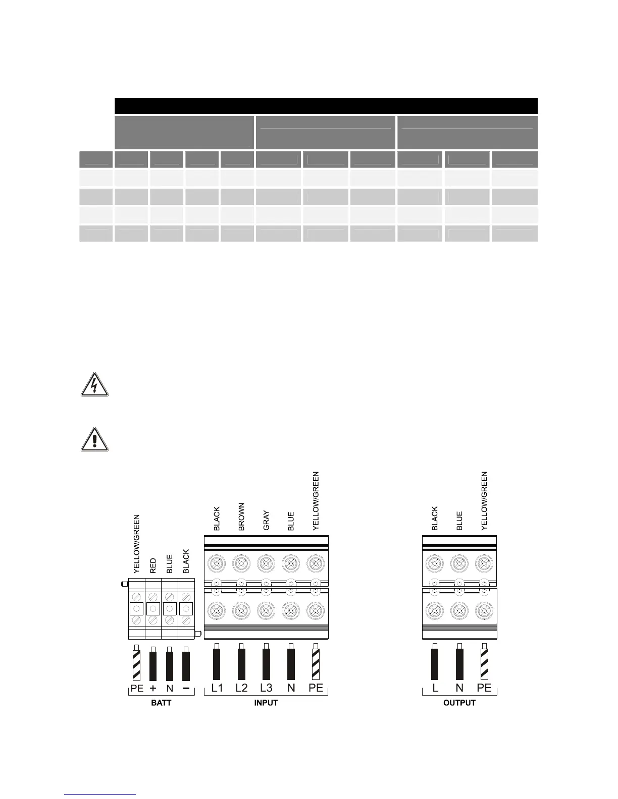 Please refer to the following table for the minimum cross-sections to be used for the input and output cables.