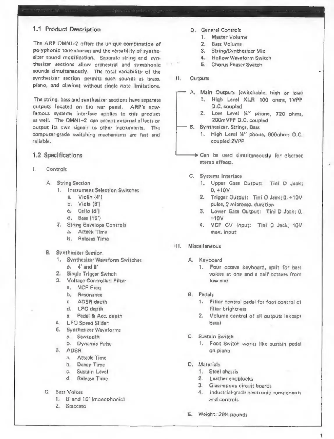 ARP Omni-2 - Product Specifications; Specifications Details