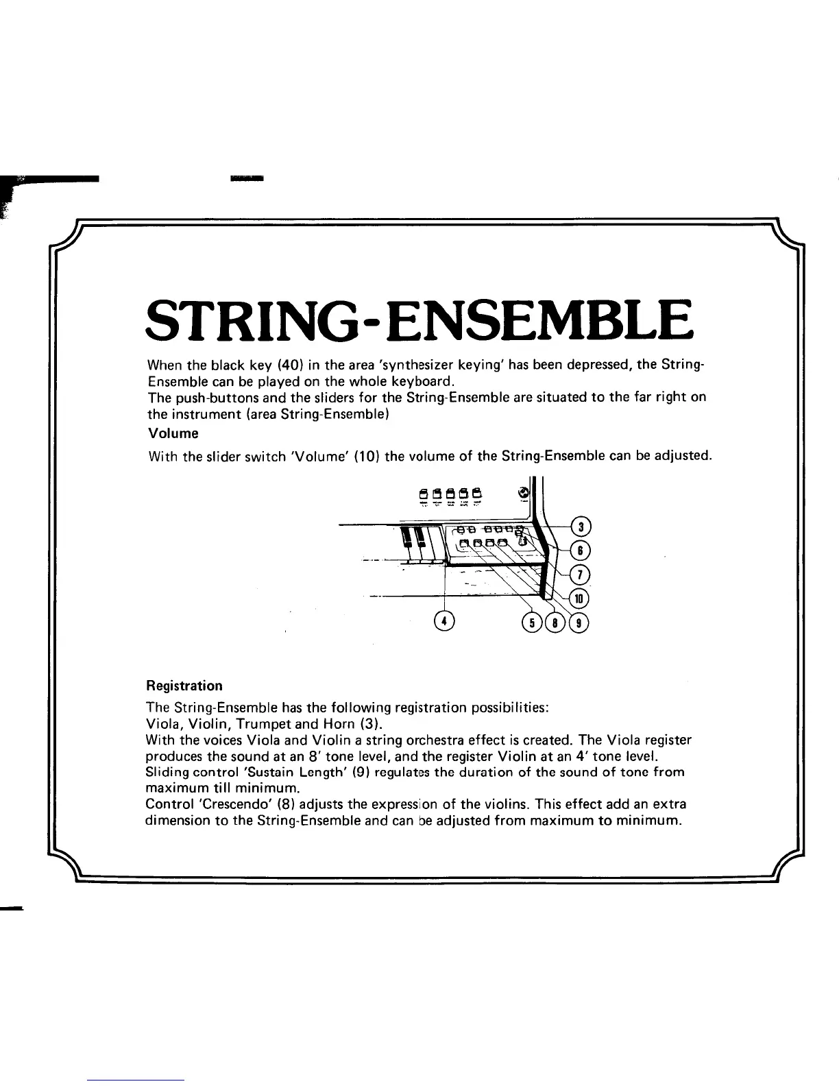 ARP Solina String - STRING-ENSEMBLE; Volume Control; String Voice Registration; Sustain and Crescendo Controls