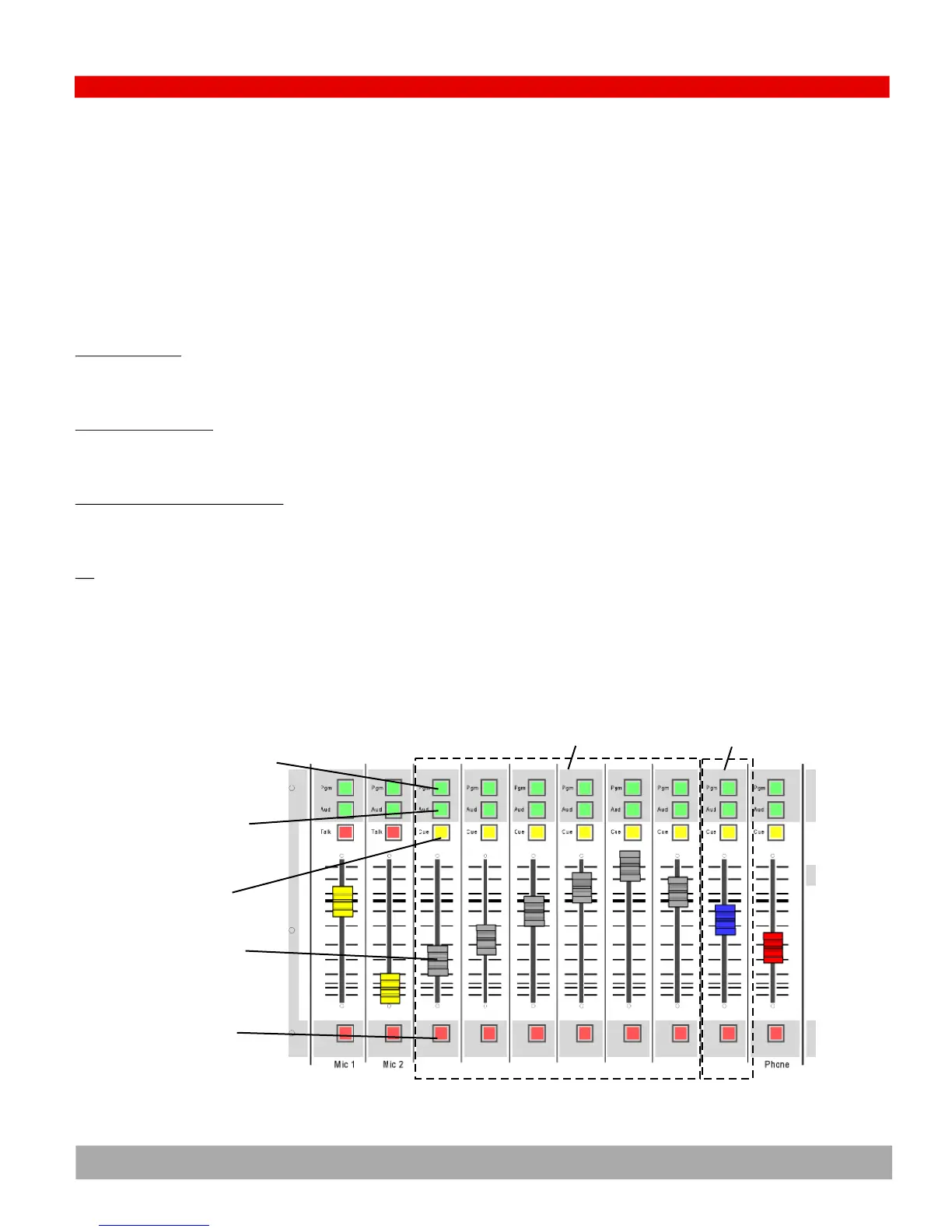 To turn a channel on, simply push the red ON switch at the bottom of the fader. When the channel is on, the switch will be lighted. To turn the channel off, simply
