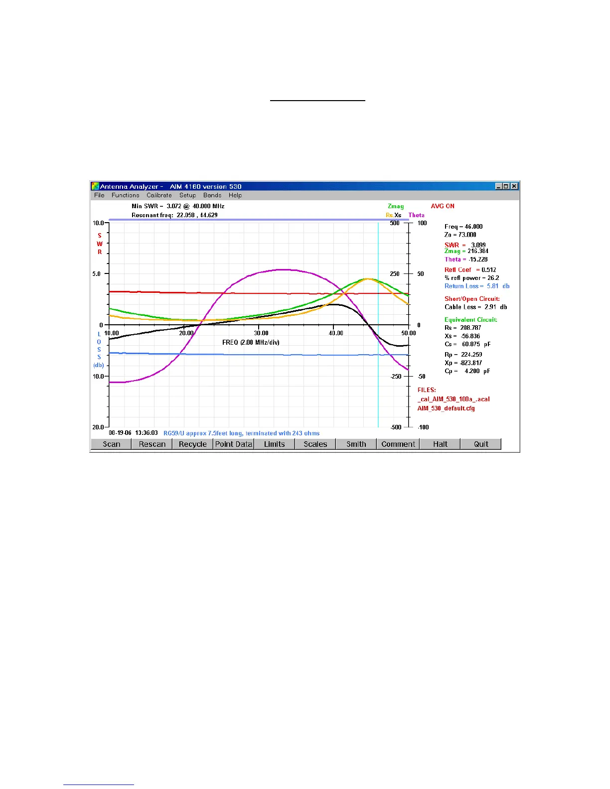 ohms. The SWR at 46.000 MHz is 3.099, Zmag=216.384 ohms, and Theta= -15.228