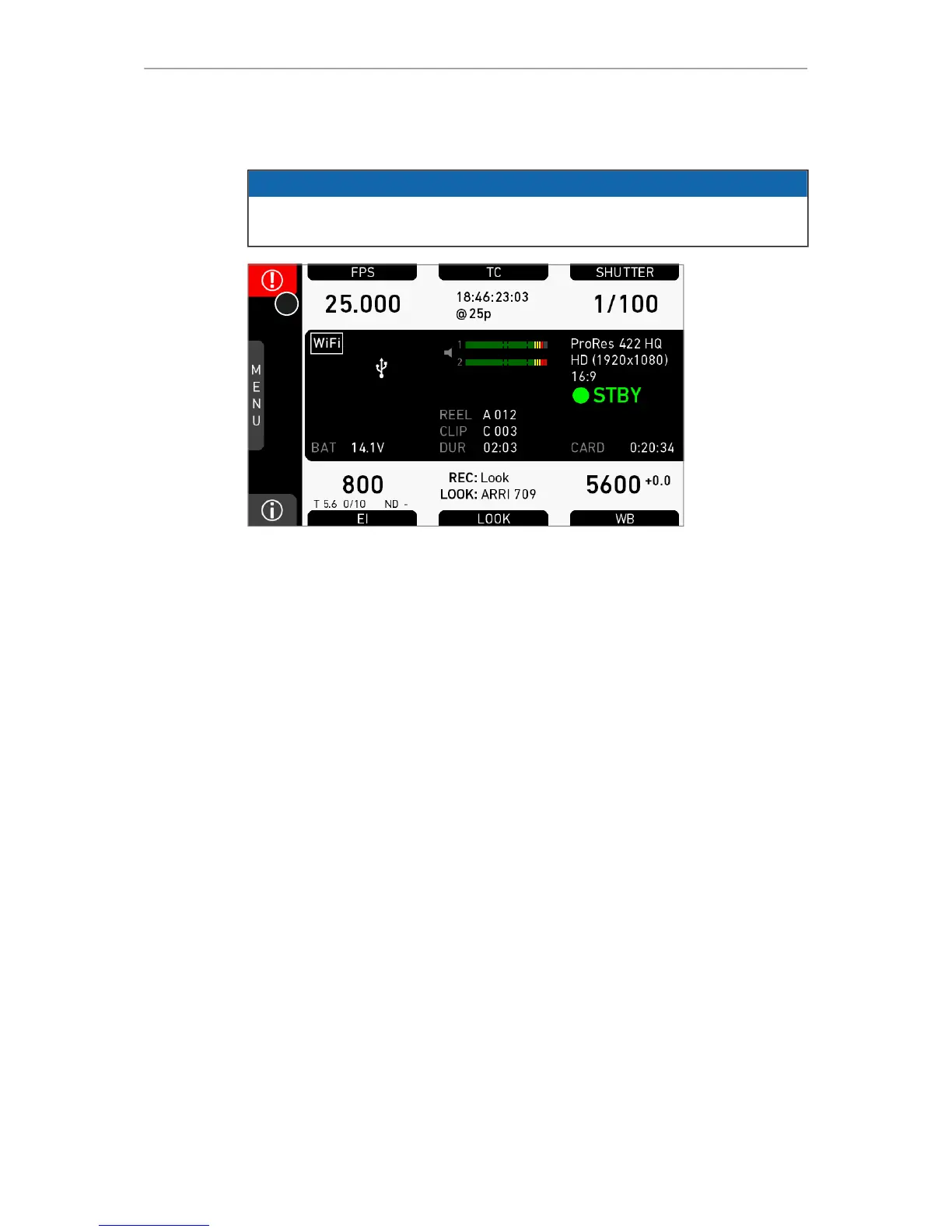 1. A red exclamation mark, visible on the homescreen, the monitor, EVF or SDI