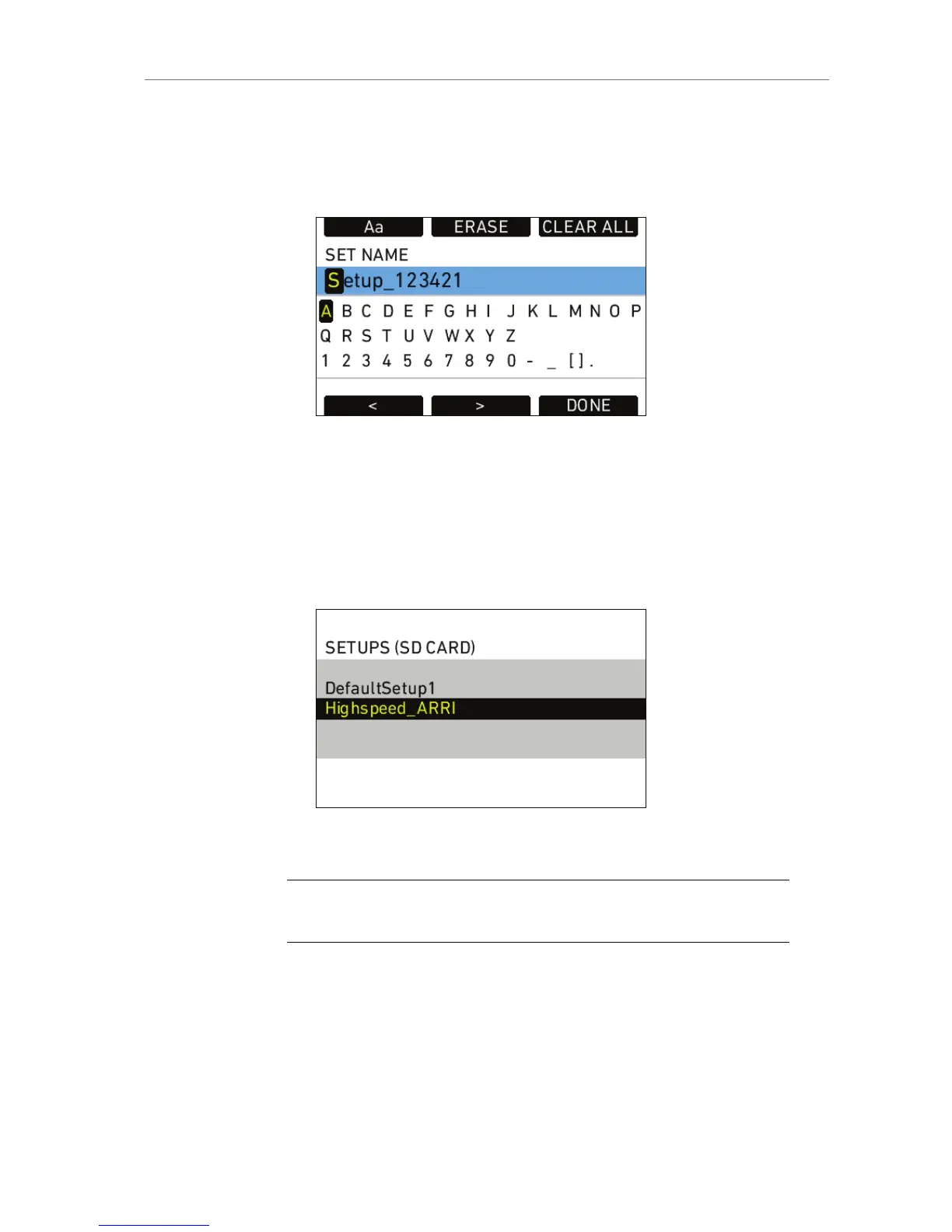 4. Use the jogwheel to select the desired setup in the list and press the