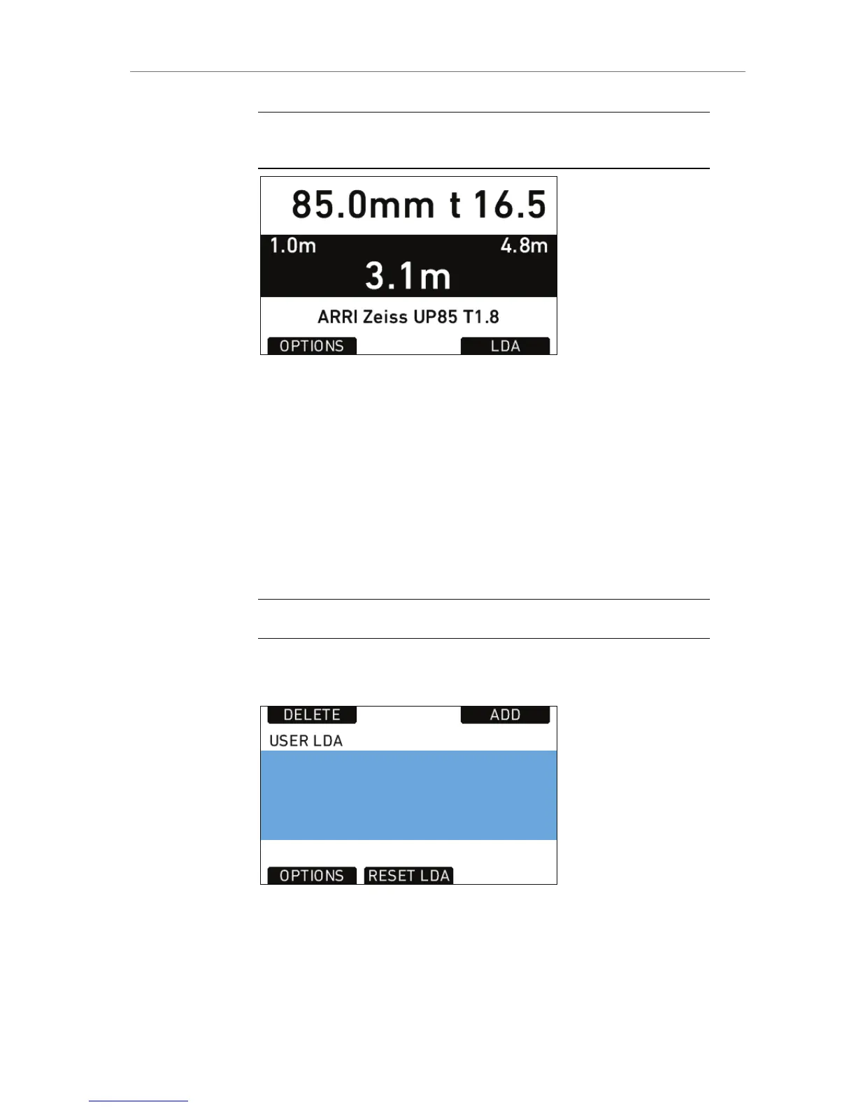 Pressing the LDA button opens the User LDA screen. Select a lens table