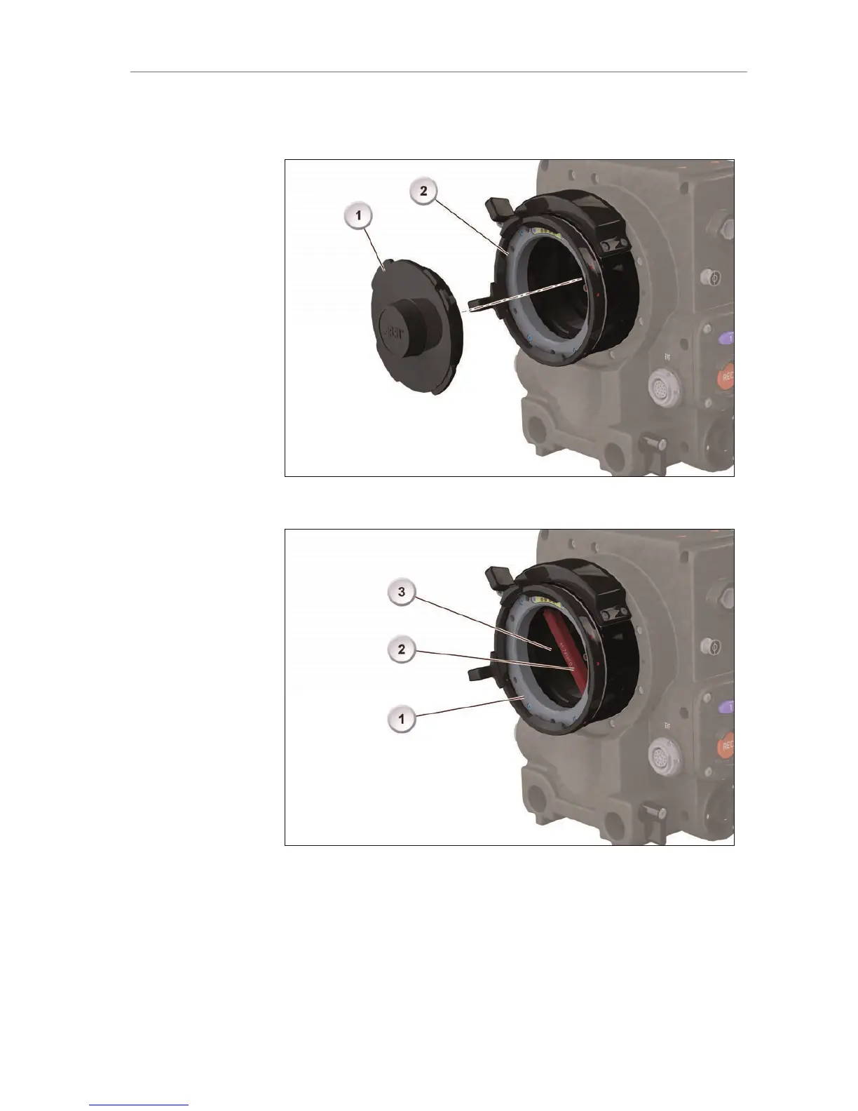 1. Remove the lens or lid (1) from the PL lens mount (2):