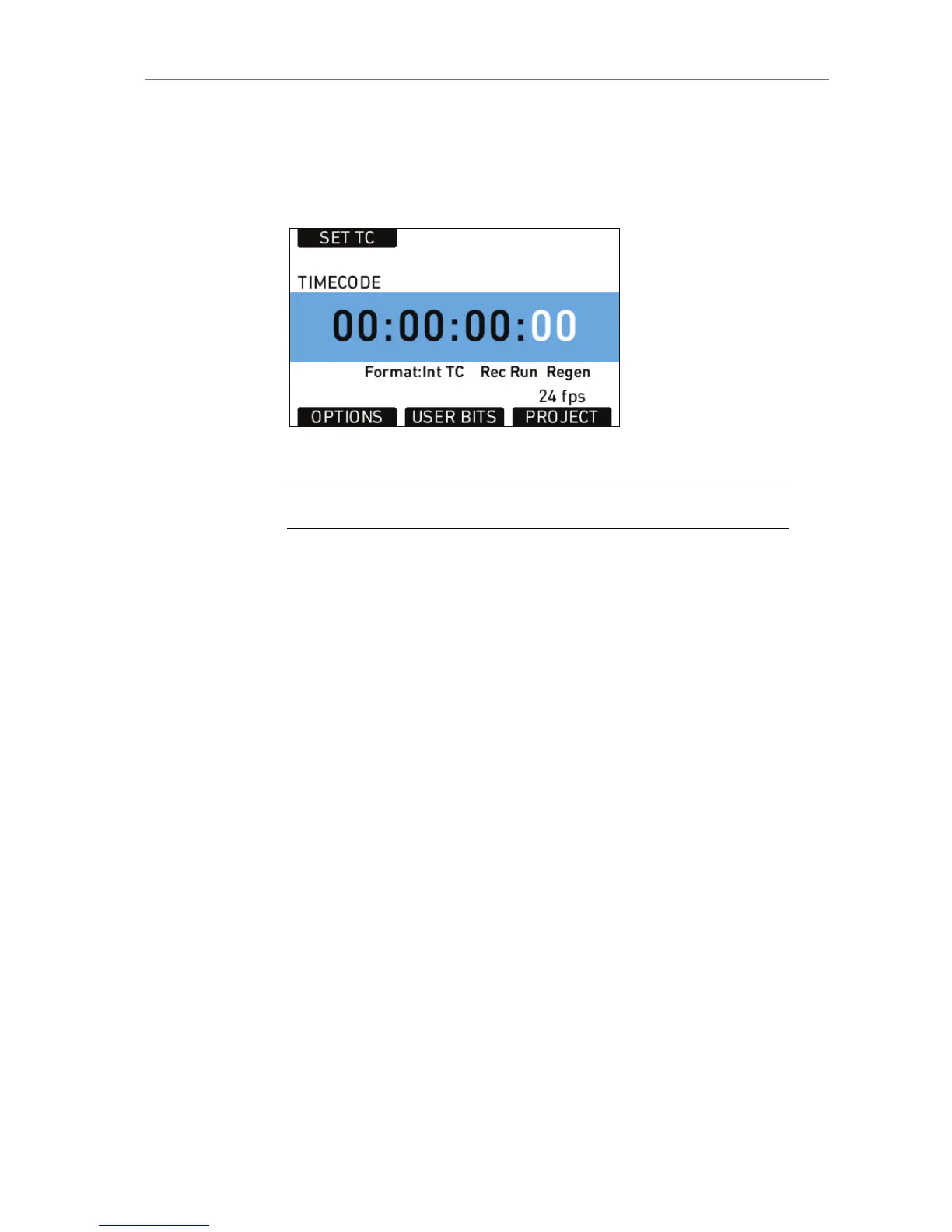 Press the TC button to open the TIMECODE screen. The TIMECODE