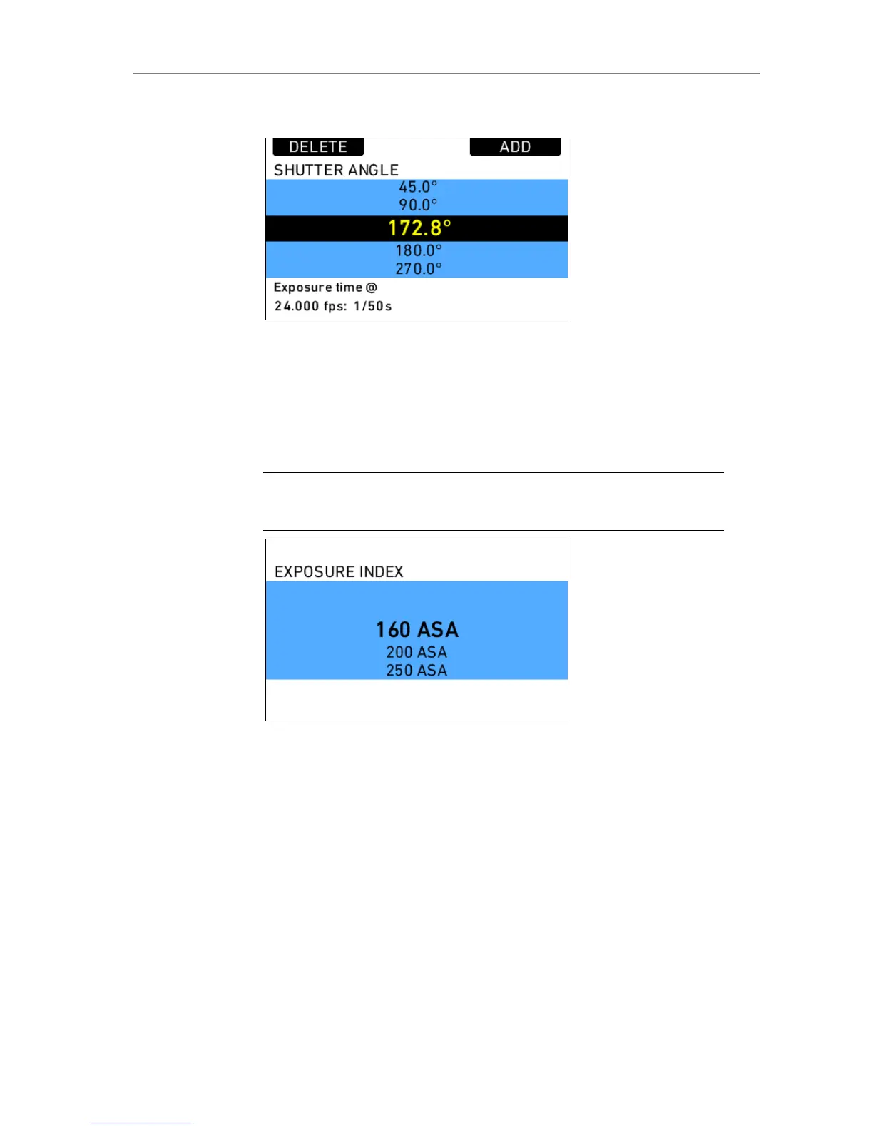 The shutter angle can be set in a range from 5.0° to 358.0°.