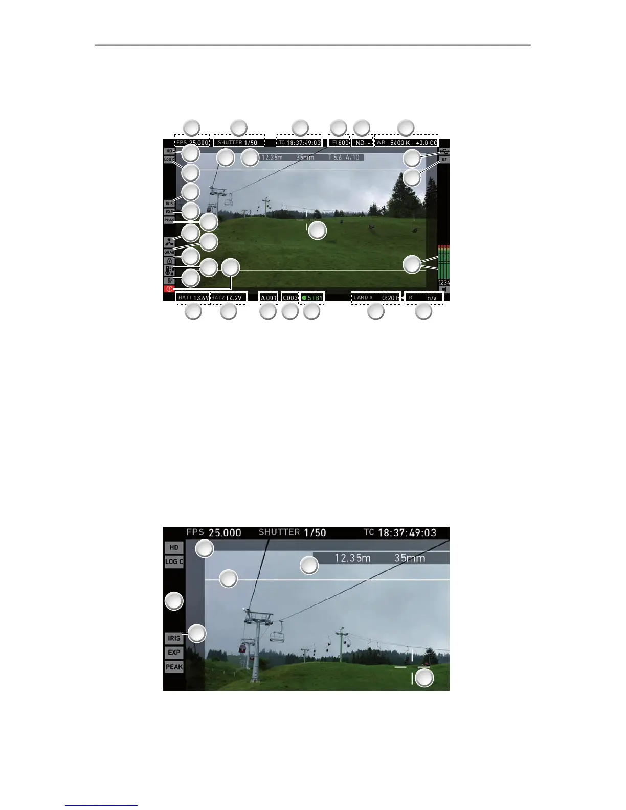 14 Camera index & reel counter 29 Lens data overlay (focus distance, focal