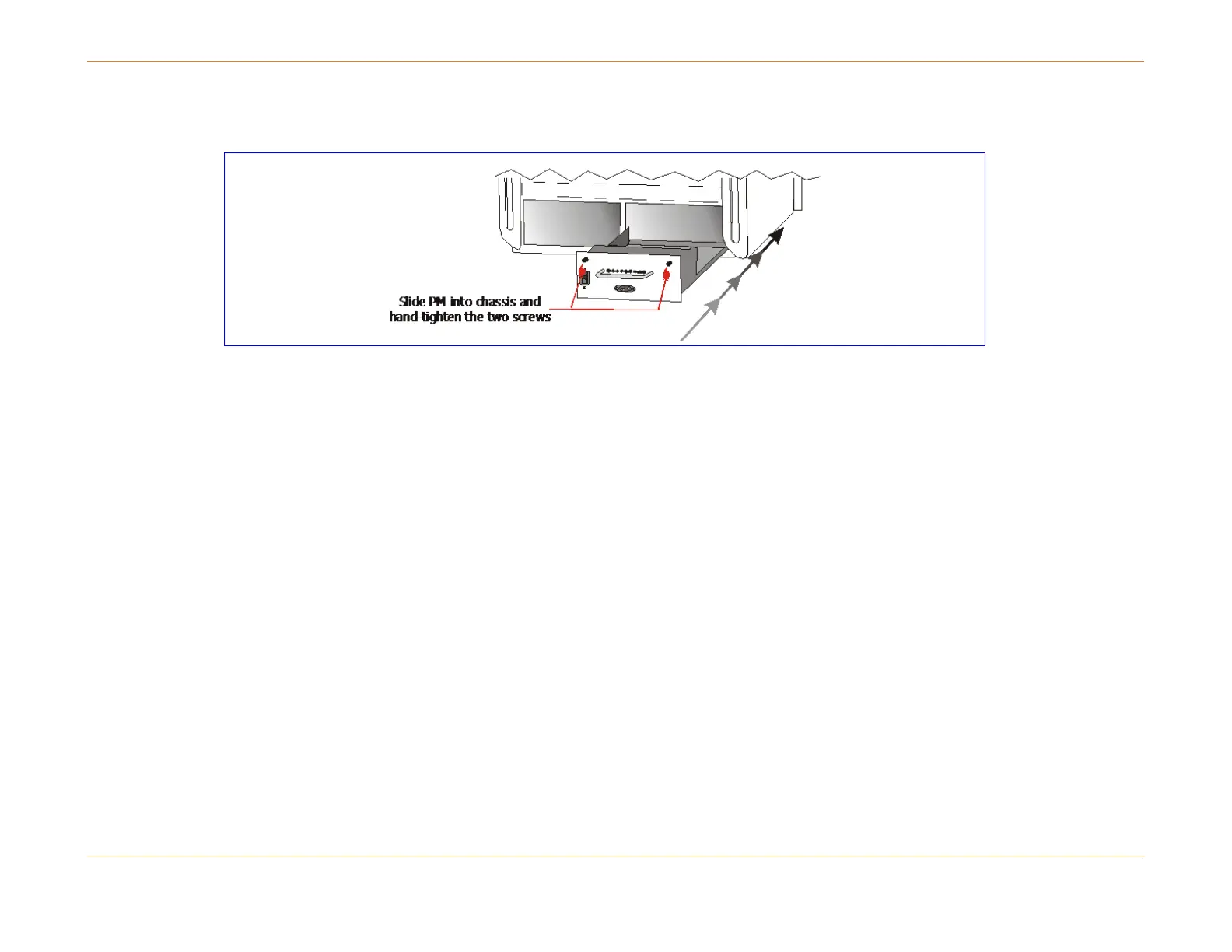3. Align the PM on the rails in the rear of the chassis and slide firmly into place. From the rear, the PM can be inserted