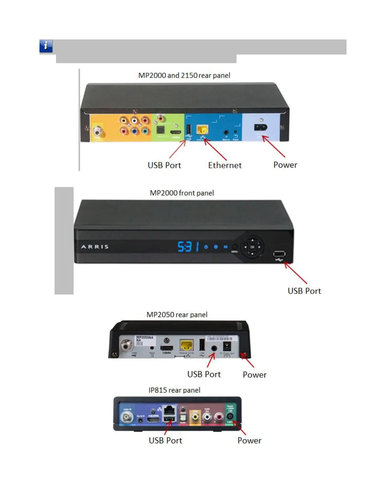 MP2000 has a USB port on the front and back and the MP2050, MP2150, and IP815 have one on the