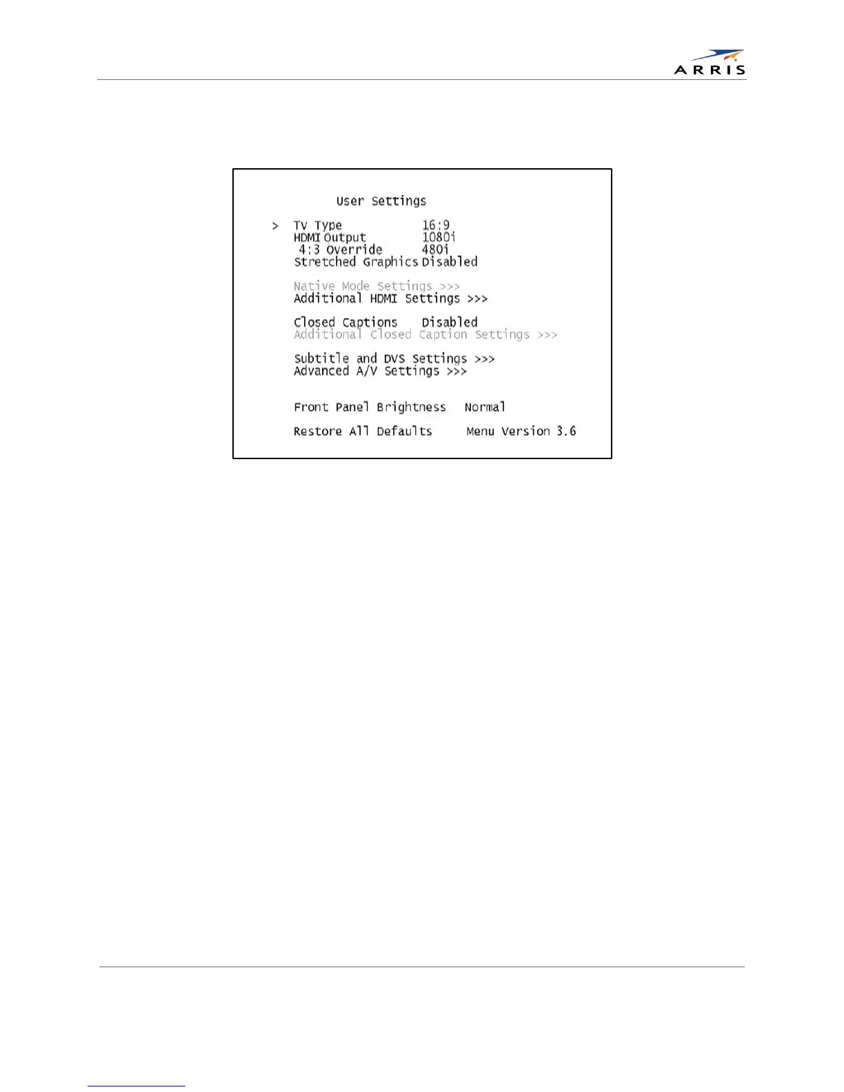 Figure 8: Default User Settings Menu When an HDMI Connection is in Place