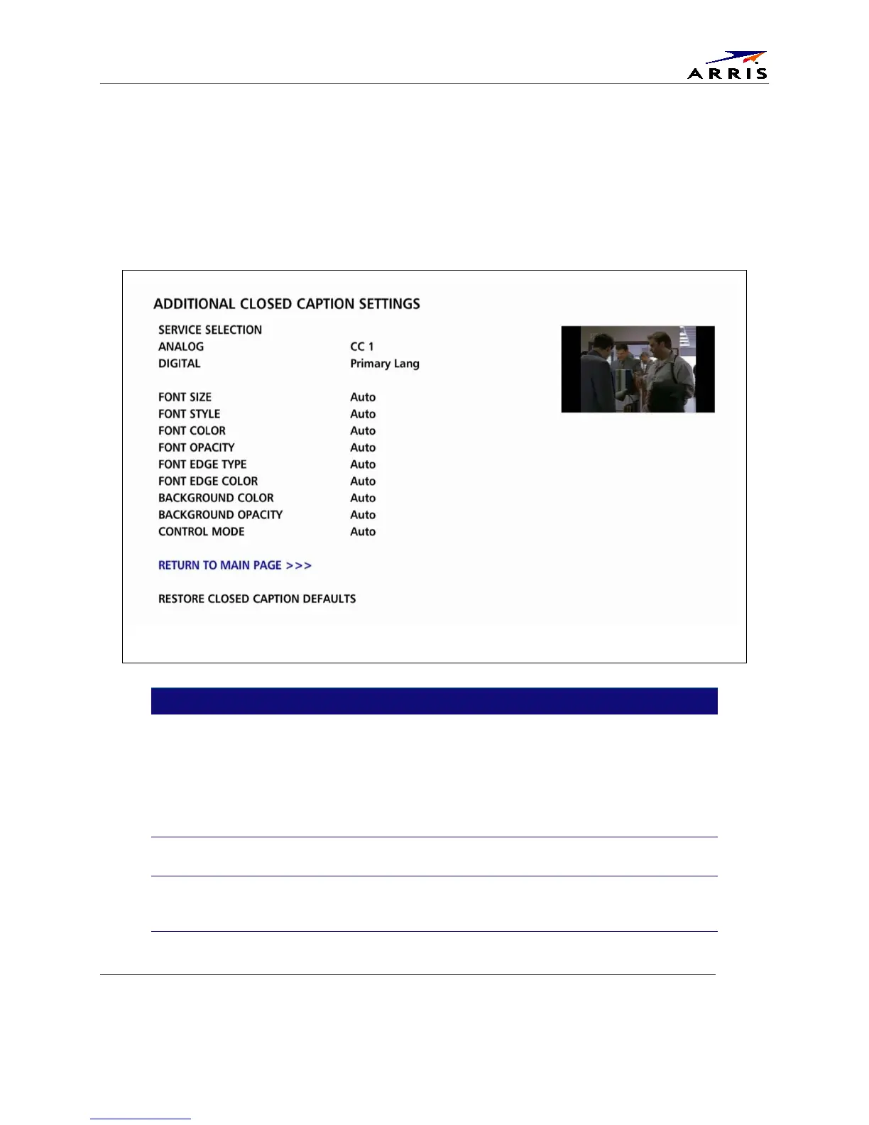 The Additional Closed Caption Settings menu screen is illustrated and defined below.