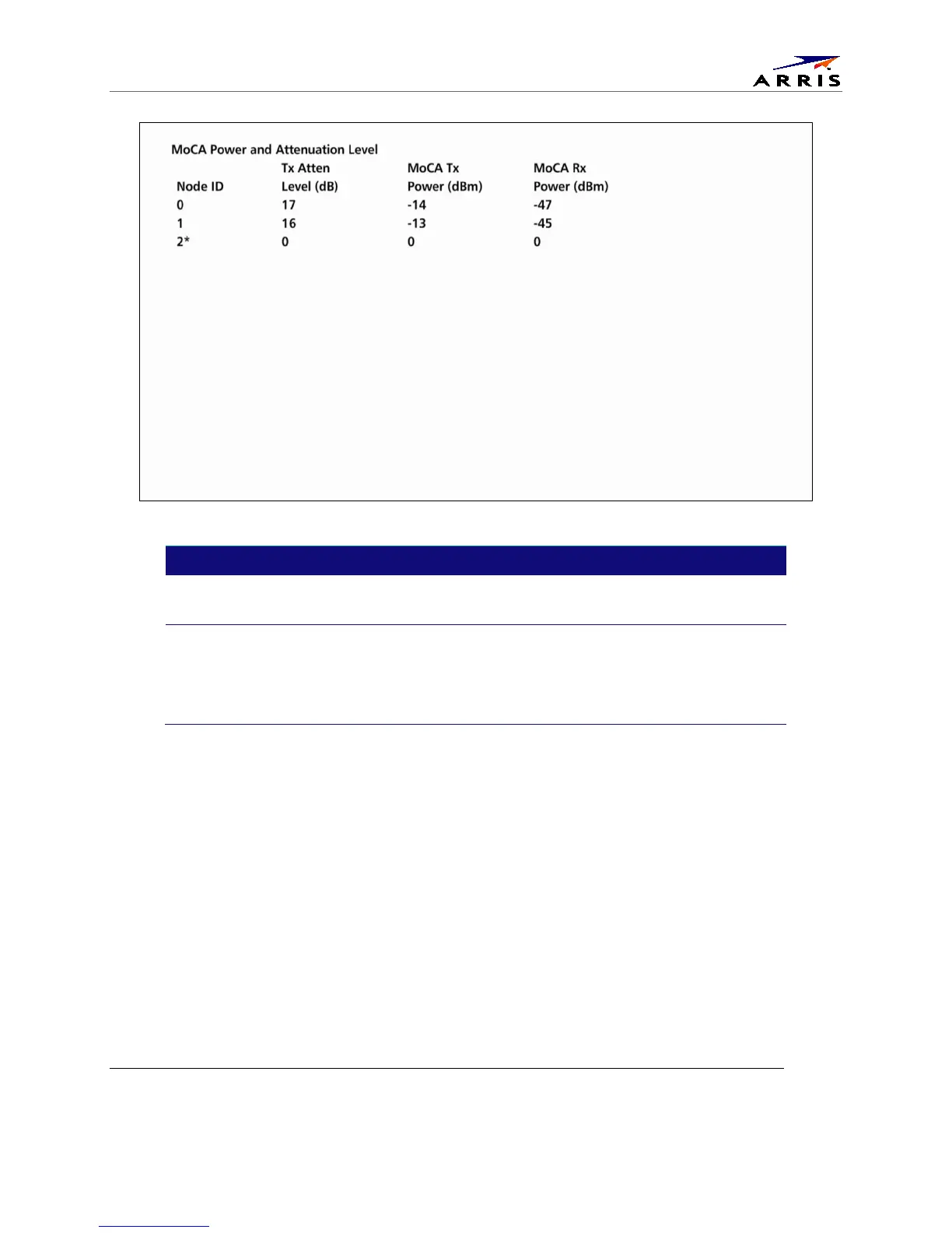 MoCA Tx Power The RF transmit power level at the connected MoCA node expressed in dBmV for