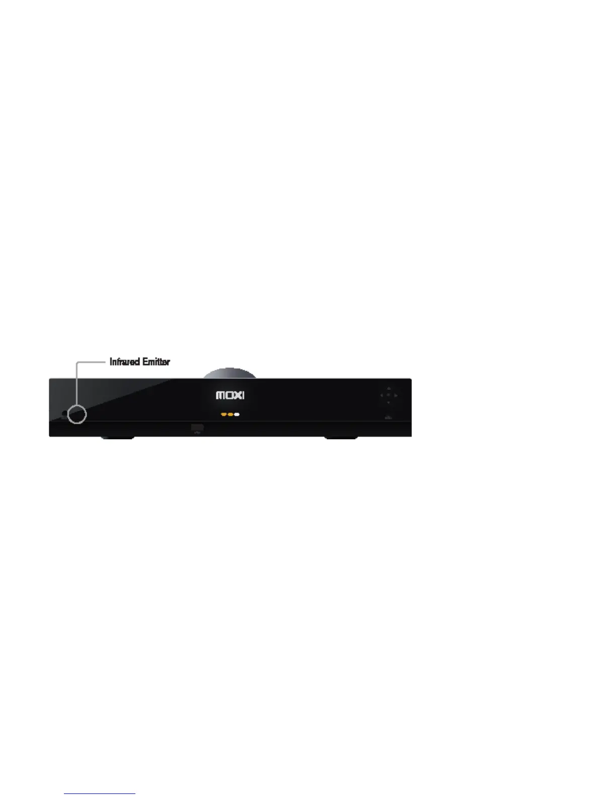 For the IR receiver to send its signals to the Moxi system, it must have a clear view of the front panel of the Moxi system (see the following figure).