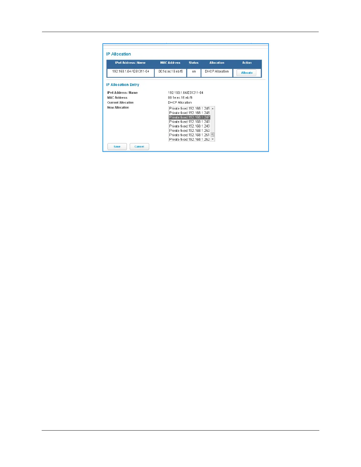 Click any of the private fixed IP addresses (192.168.1.64 to 192.168.1.253) shown in the list to allocate