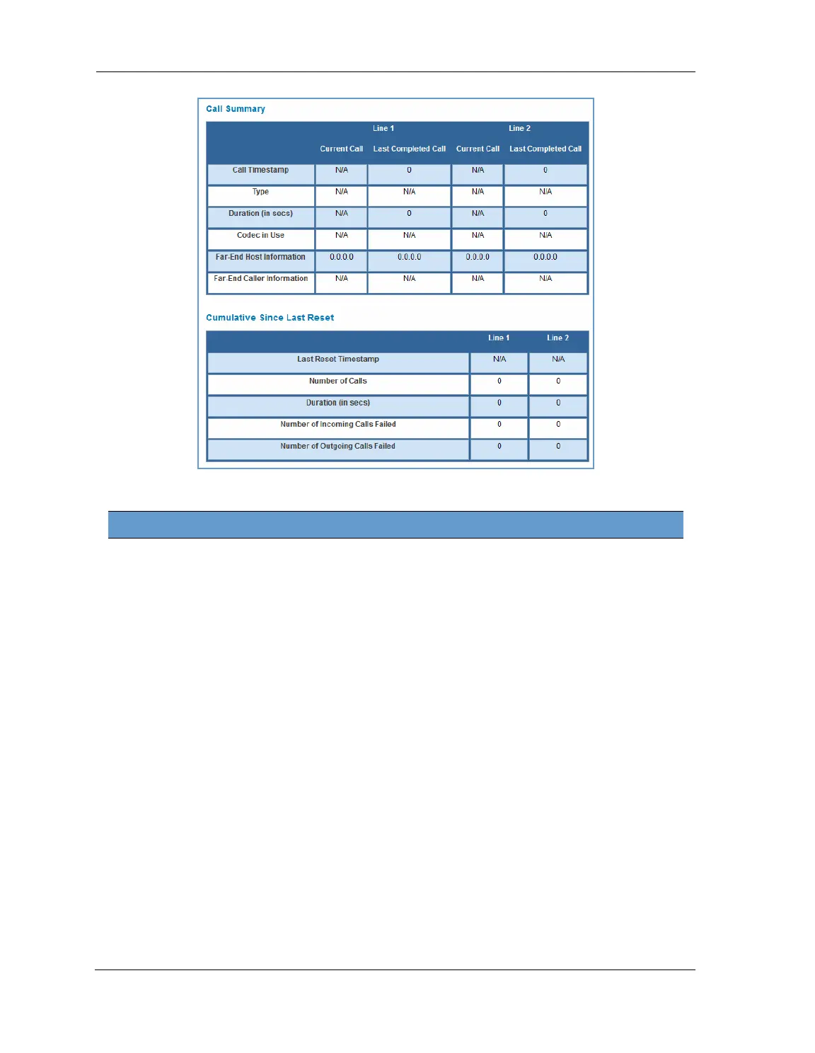 For Line 1 and Line 2, the two available phone lines, the Call Summary section displays the following