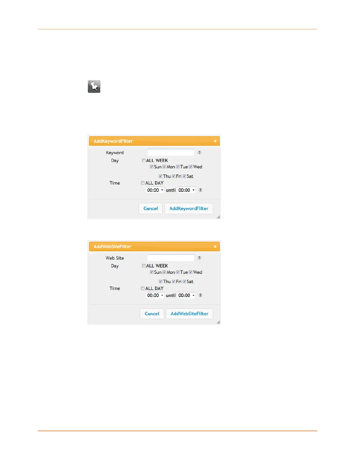8. Click the Add Keyword Filter or Add Web Site Filter button respectively. Then click the
