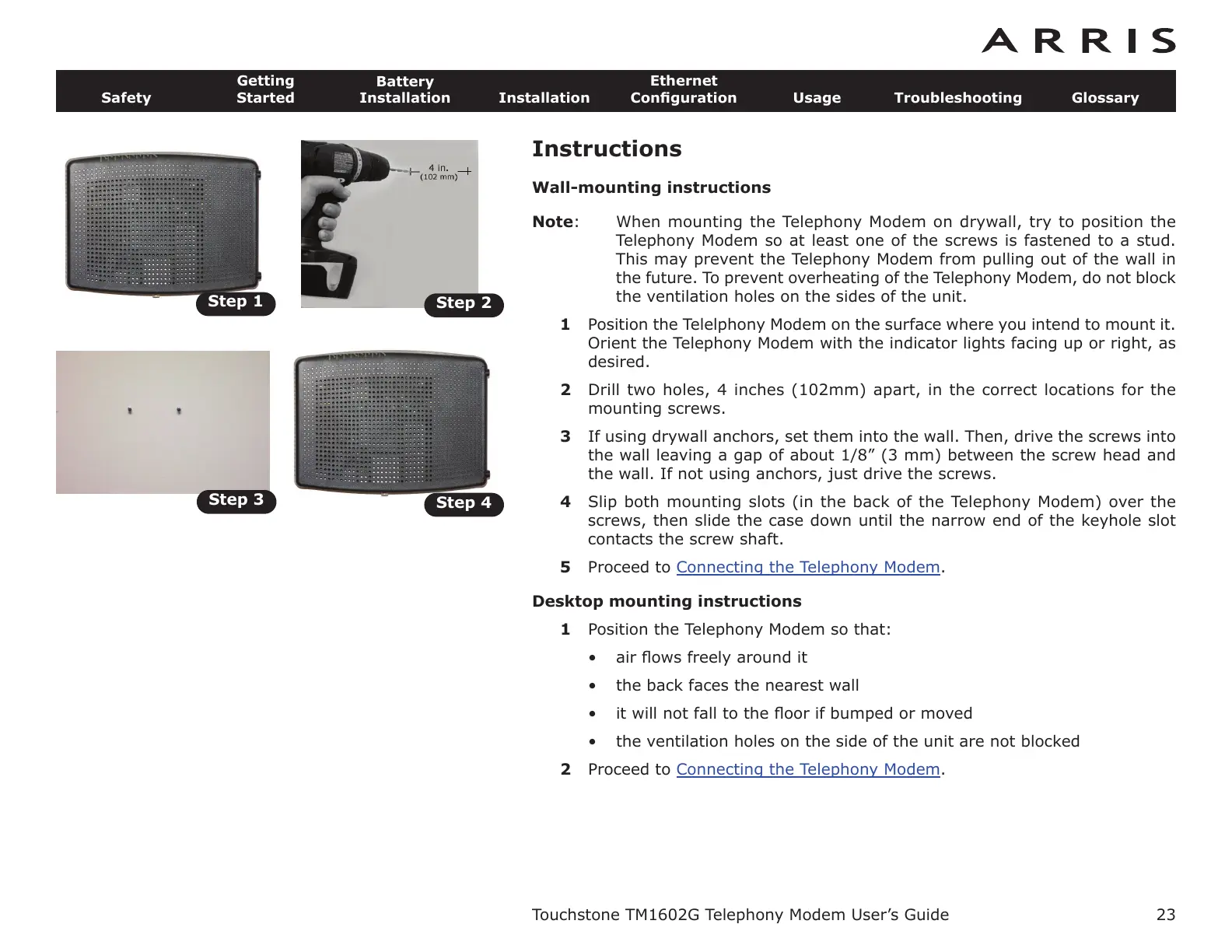 Note: When mounting the Telephony Modem on drywall, try to position the
