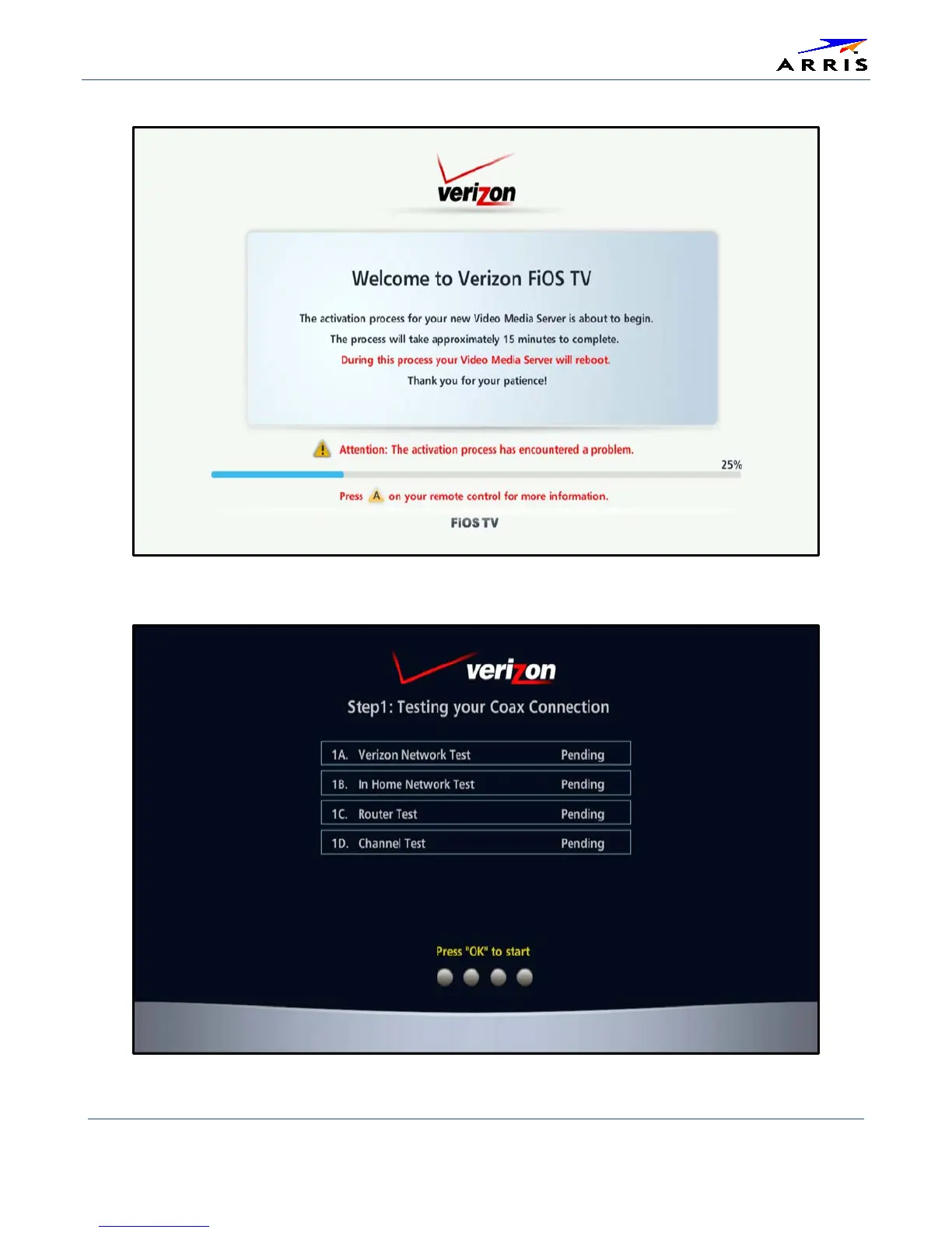 Arris VMS1100 - Figure 19 - Sample Welcome-Start Activation Error Screen; Figure 20 - Step 1:-Coax Connection Test Screen (1 of 5)