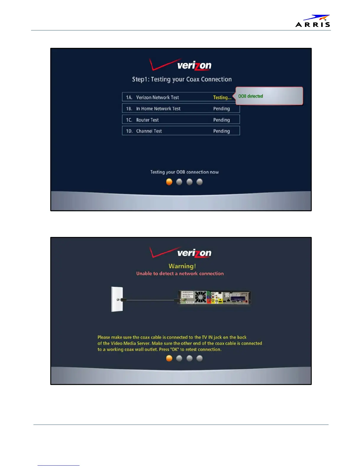 Arris VMS1100 - Figure 21 - Step 1:-Coax Connection Test Screen (2 of 5); Figure 22 - Step 1: Sample Coax Connection Warning Screen (3 of 5)