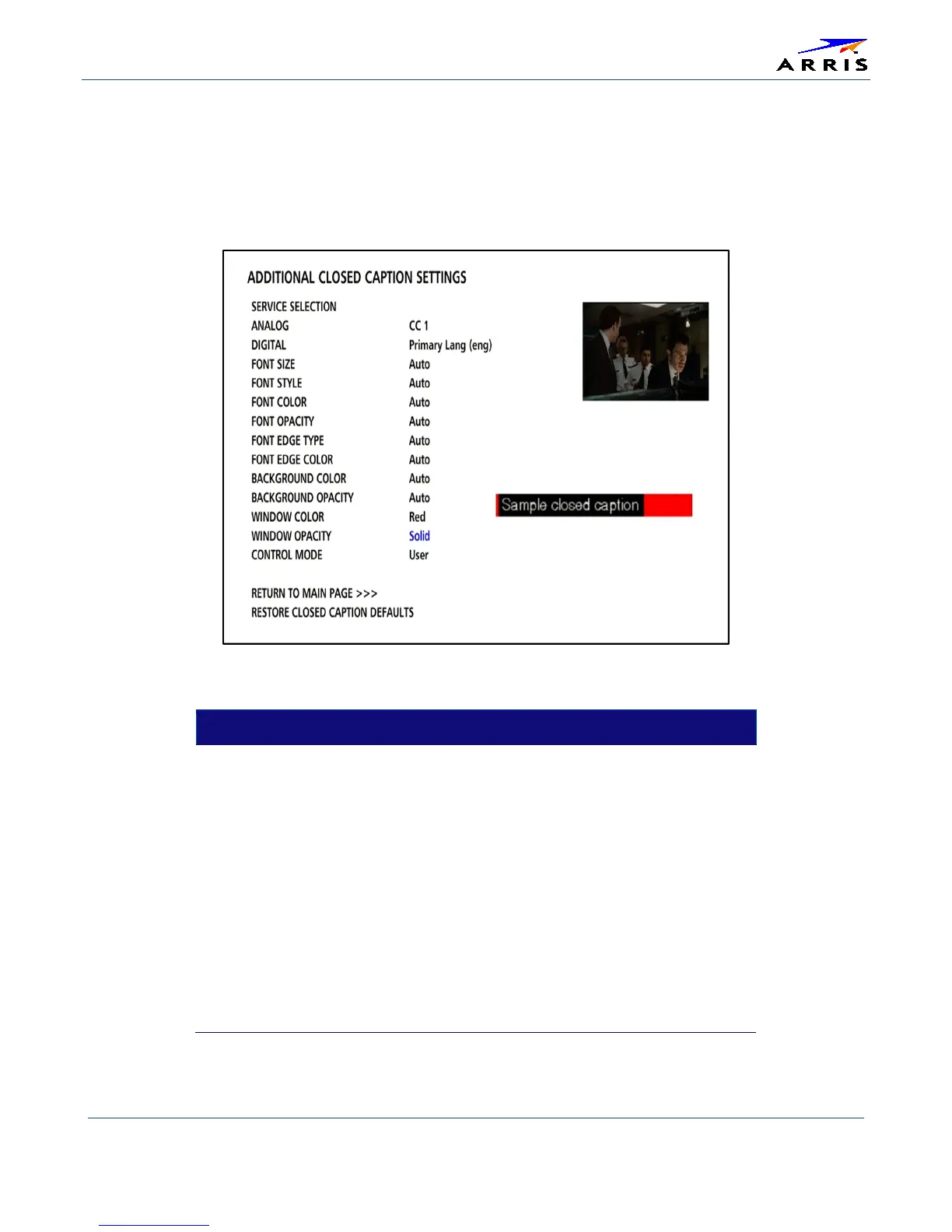 The Additional Closed Caption Settings menu is used to adjust the various display options for closed caption