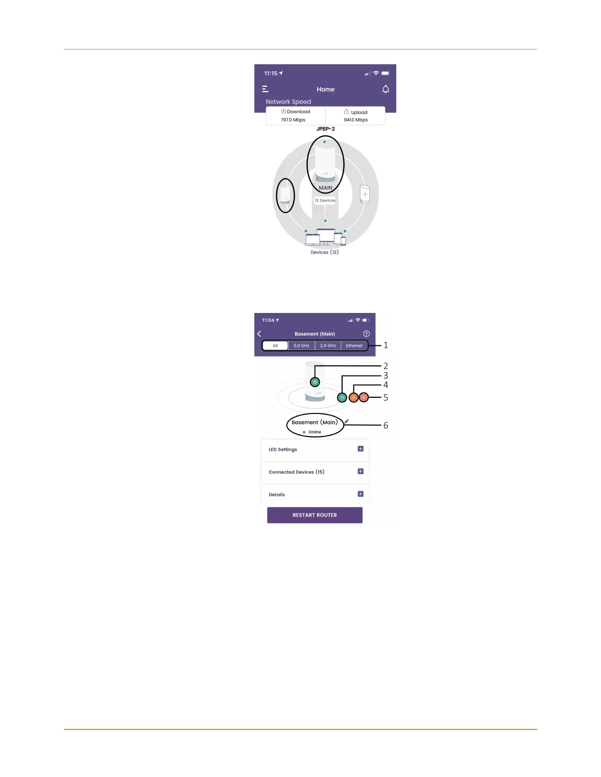 The details window for the router or satellite displays the device's name at the top of the