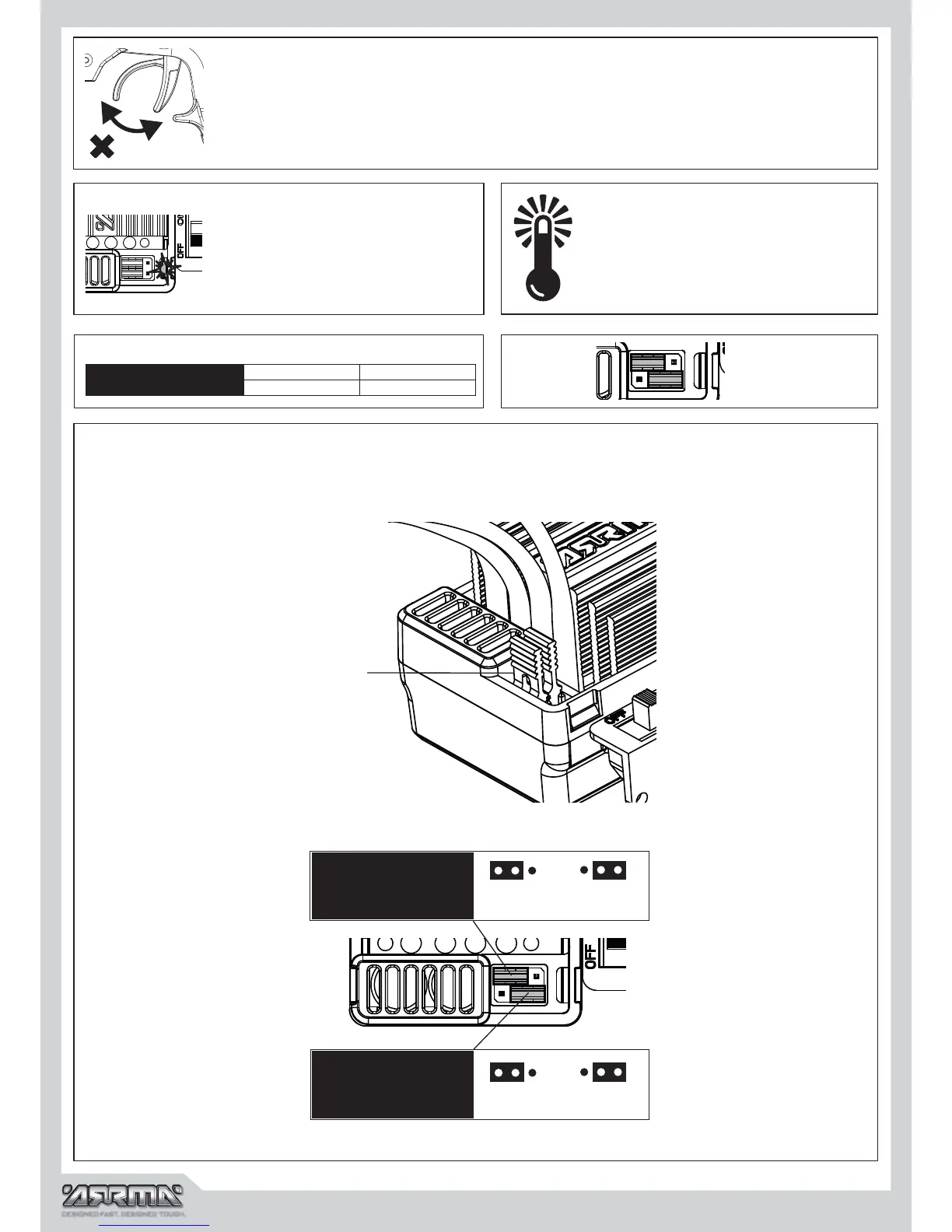 The MEGA brushed ESC has two tuning options - battery mode and reverse lock out. The setting of these modes can be changed by