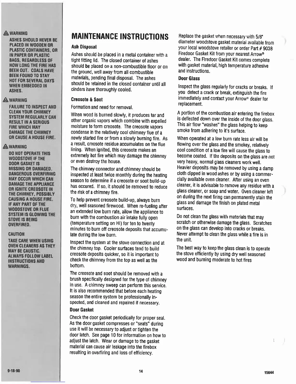 Arrow 1890 - MAINTENANCE INSTRUCTIONS; Creosote & Soot; Door Gasket; Door Glass