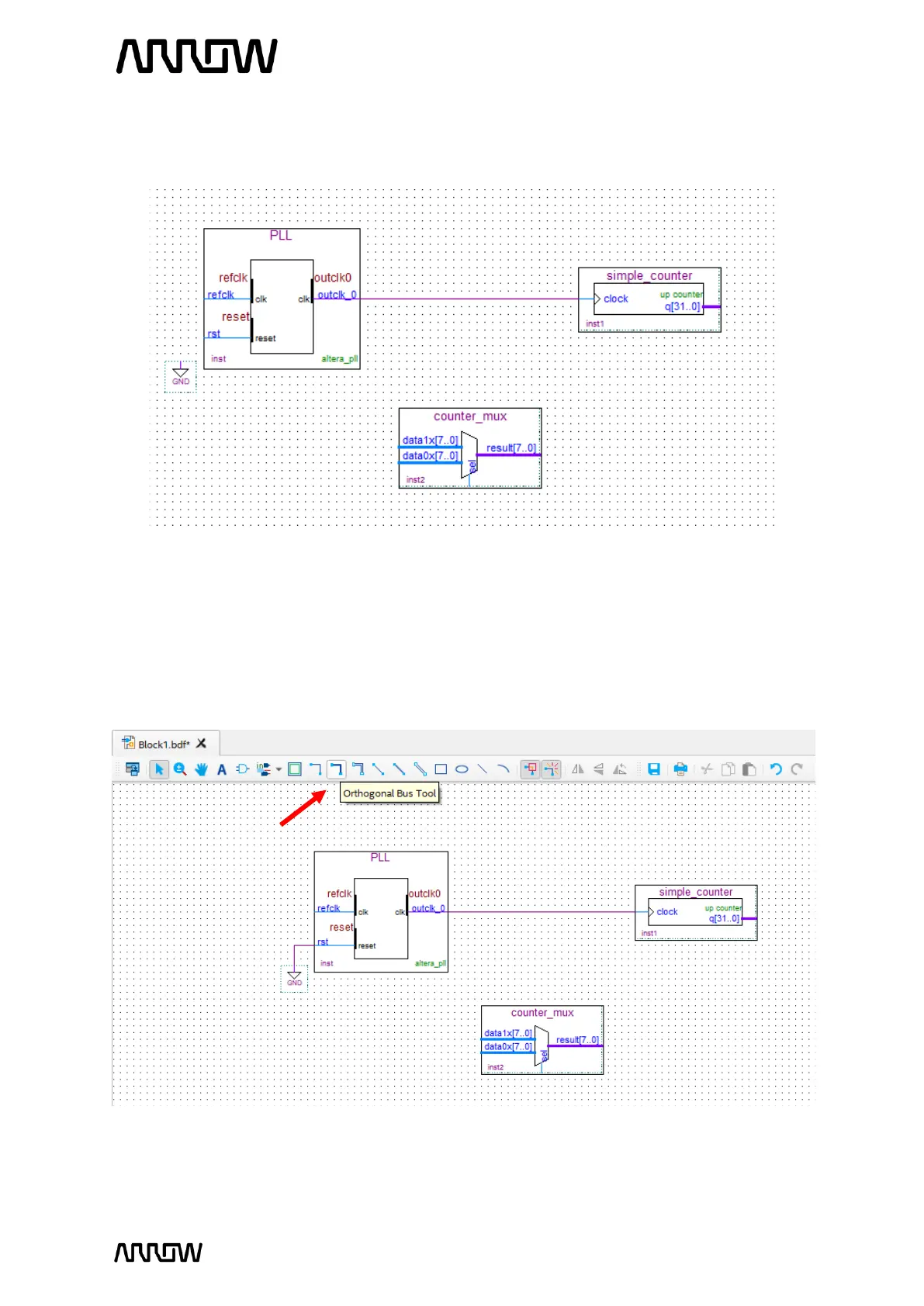 5.2.8.2 Connect the outclk0 of the PLL to the clock input of the simple_counter as shown