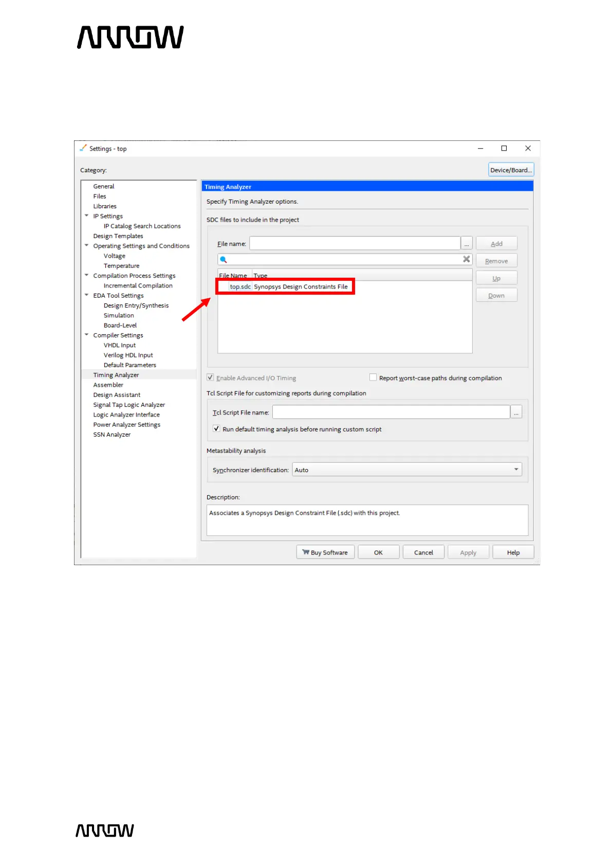 Analyzer”. The top.sdc should have been already added by default. If it is not, it will need