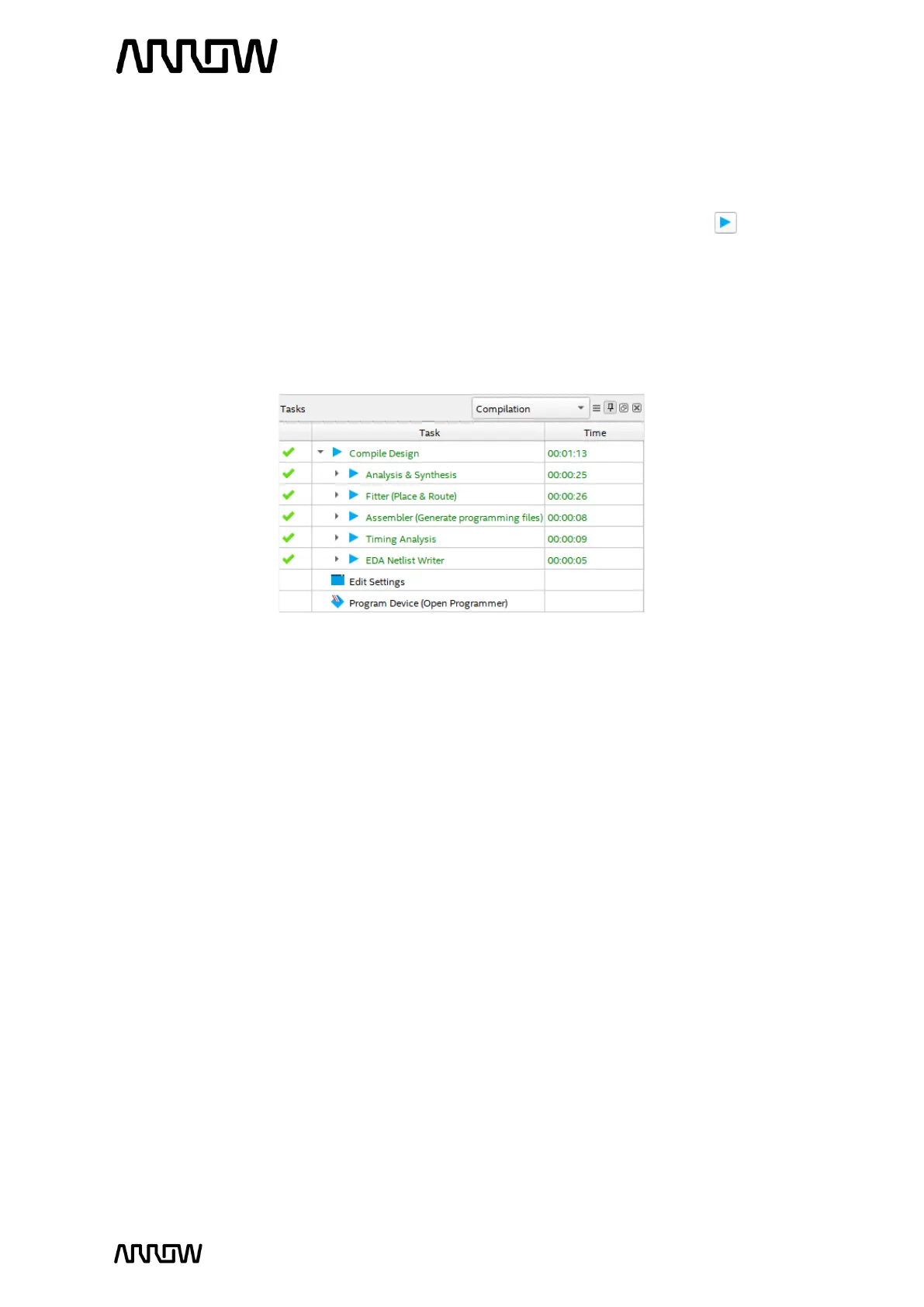 5.2.13.2 To compile the design, select Processing ā Start Compilation or push the button on