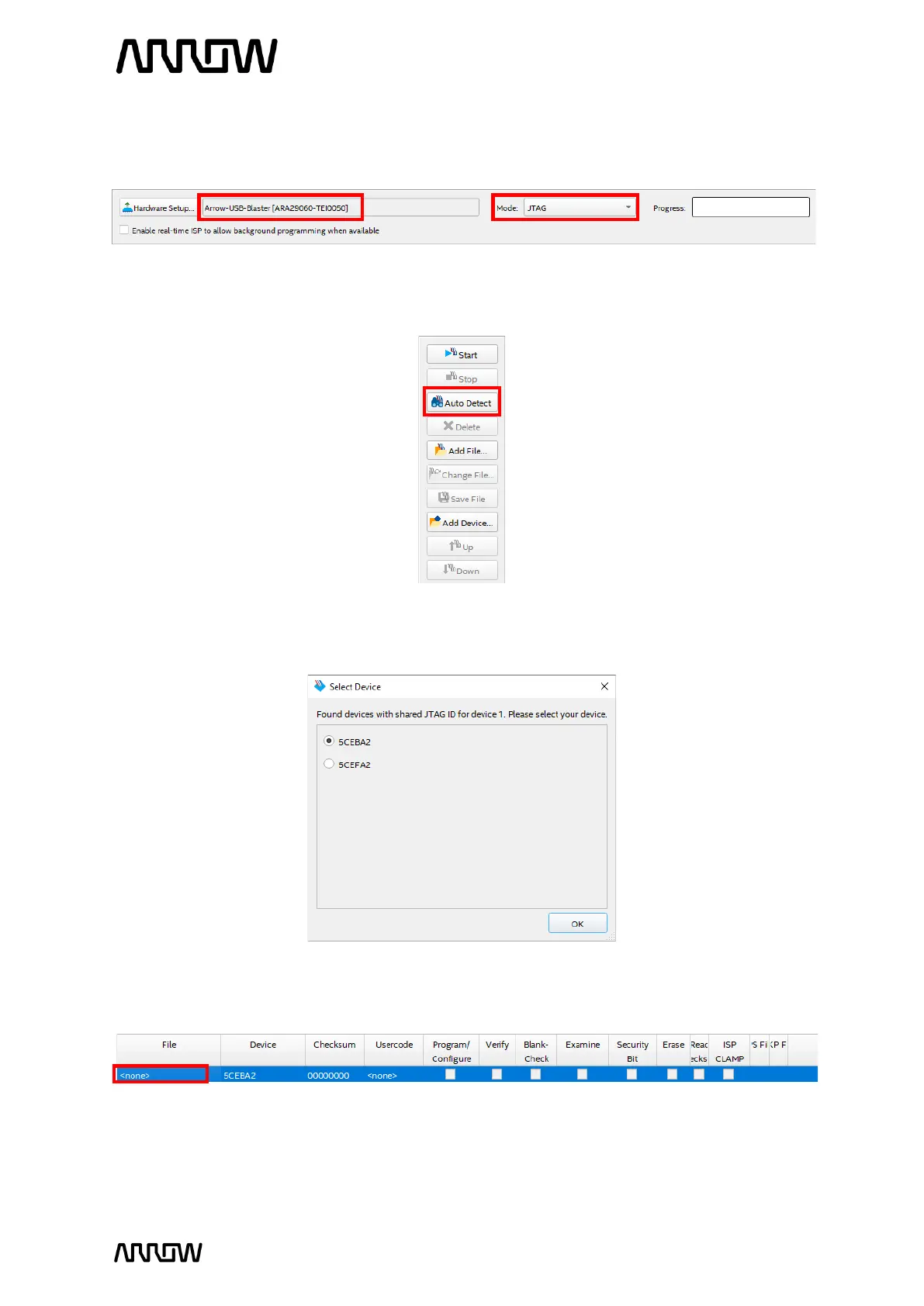 6.1.7 Make sure the hardware setup is Arrow-USB-Blaster [USB0] and the mode is JTAG. If the