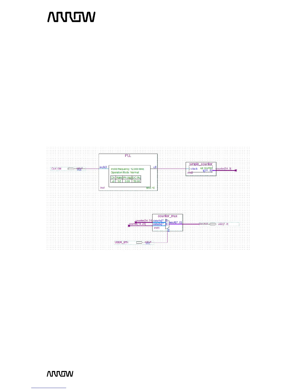 There are three components in the system: a PLL, a counter and a mux. The components, in the