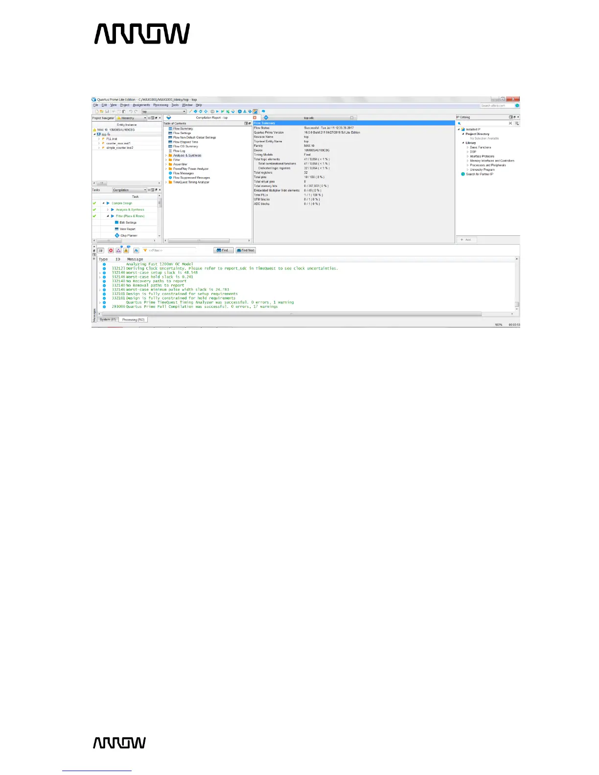 After successfully compiling the design, a Compilation Report should appear as shown above: