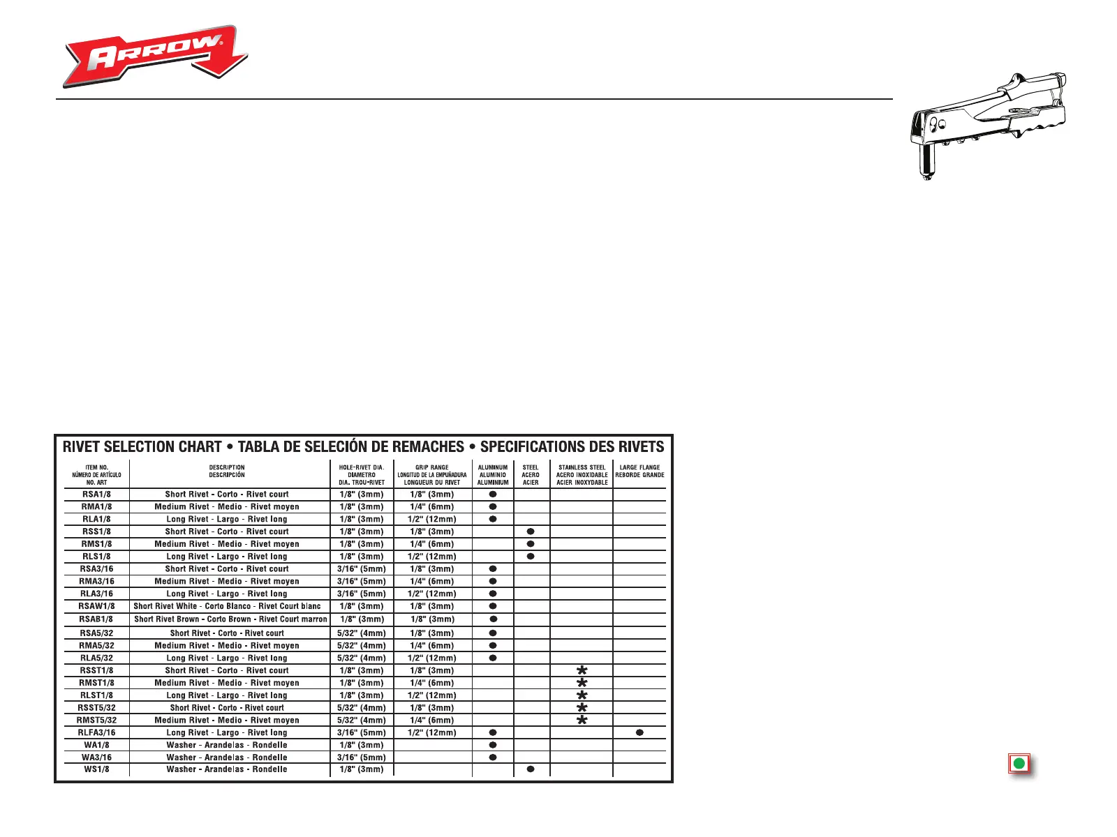 Arrow accessories and genuine Arrow rivets are available at retail outlets, hardware stores,